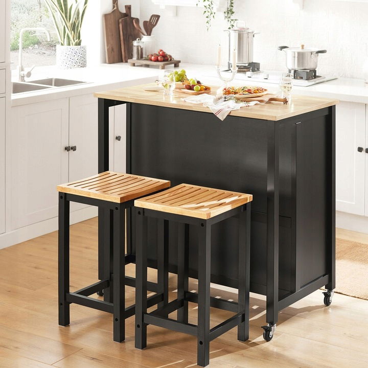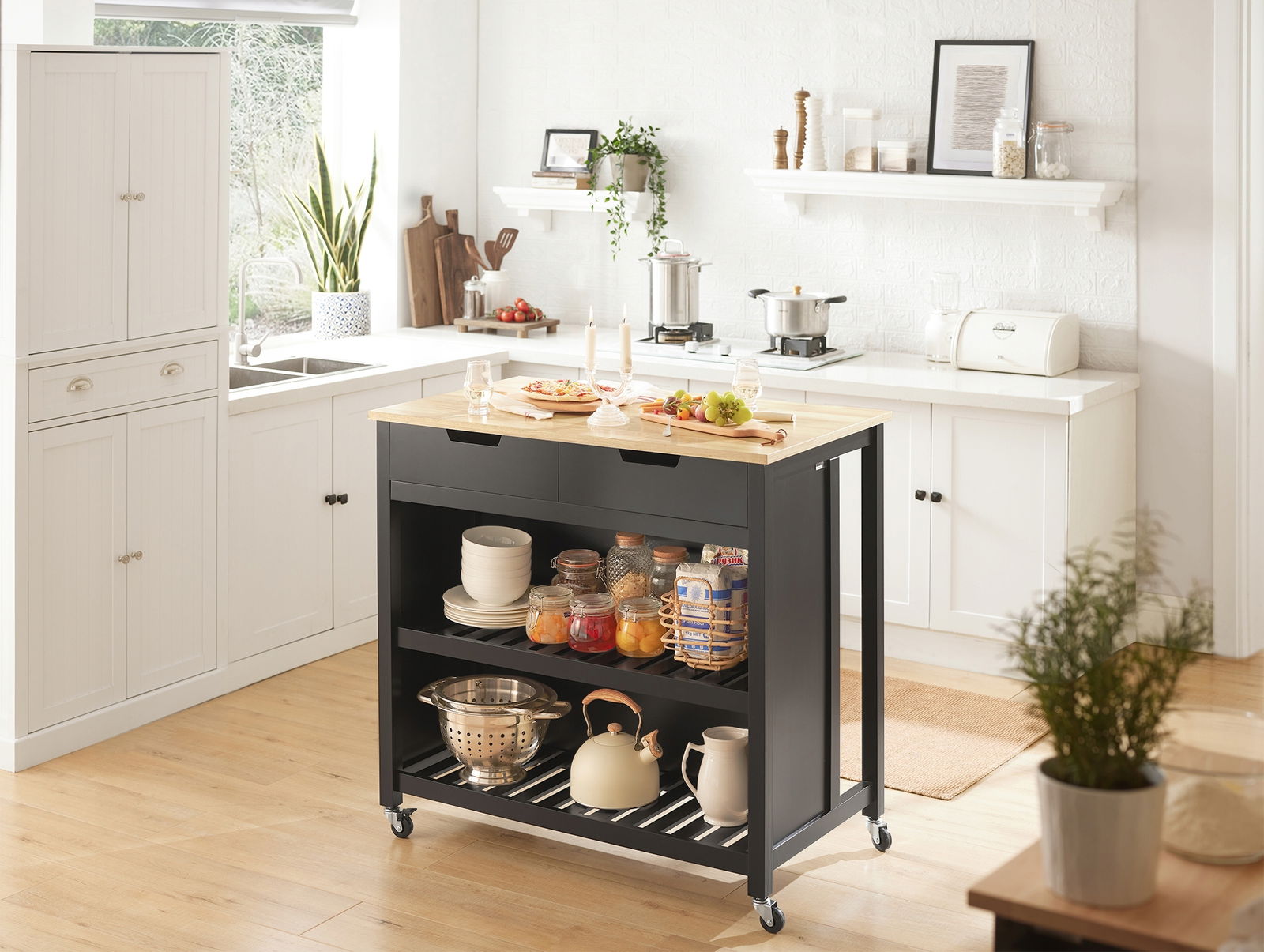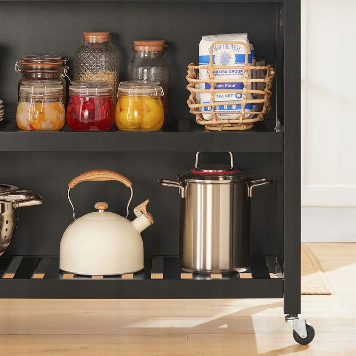 Opis Produktu: Nasza wyspa kuchenna to niezastąpiony pomocnik w każdej kuchni, oferujący dodatkową powierzchnię roboczą i przestrzeń do przechowywania. Wyspa jest wyposażona w dwie pojemne szuflady oraz dwie duże półki, na których można przechowywać różne akcesoria kuchenne. Dzięki czterem kółkom, w tym dwóm z blokadą, łatwo przemieścisz wyspę w dowolne miejsce, zapewniając elastyczność w organizacji kuchni.
