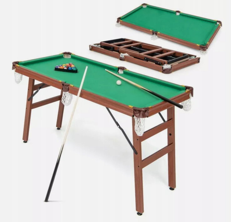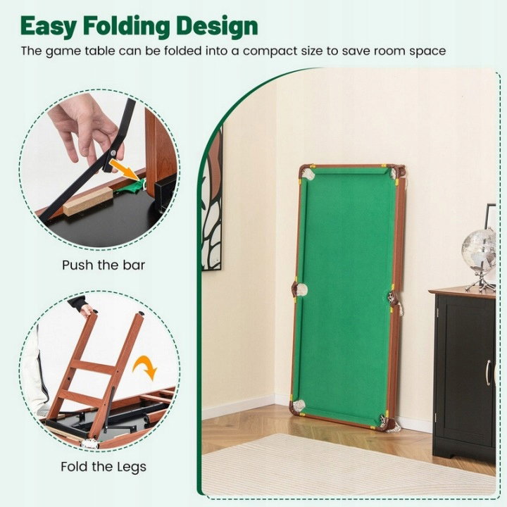 ● Łatwe składanie: Stół do gry w bilard został zaprojektowany z łatwym mechanizmem składania, który umożliwia złożenie go i przechowywanie w niewielkich rozmiarach, oszczędzając cenną przestrzeń w pomieszczeniu. Wystarczy popchnąć drążek i złożyć nogi bez wysiłku, aby zapewnić wygodne przechowywanie.