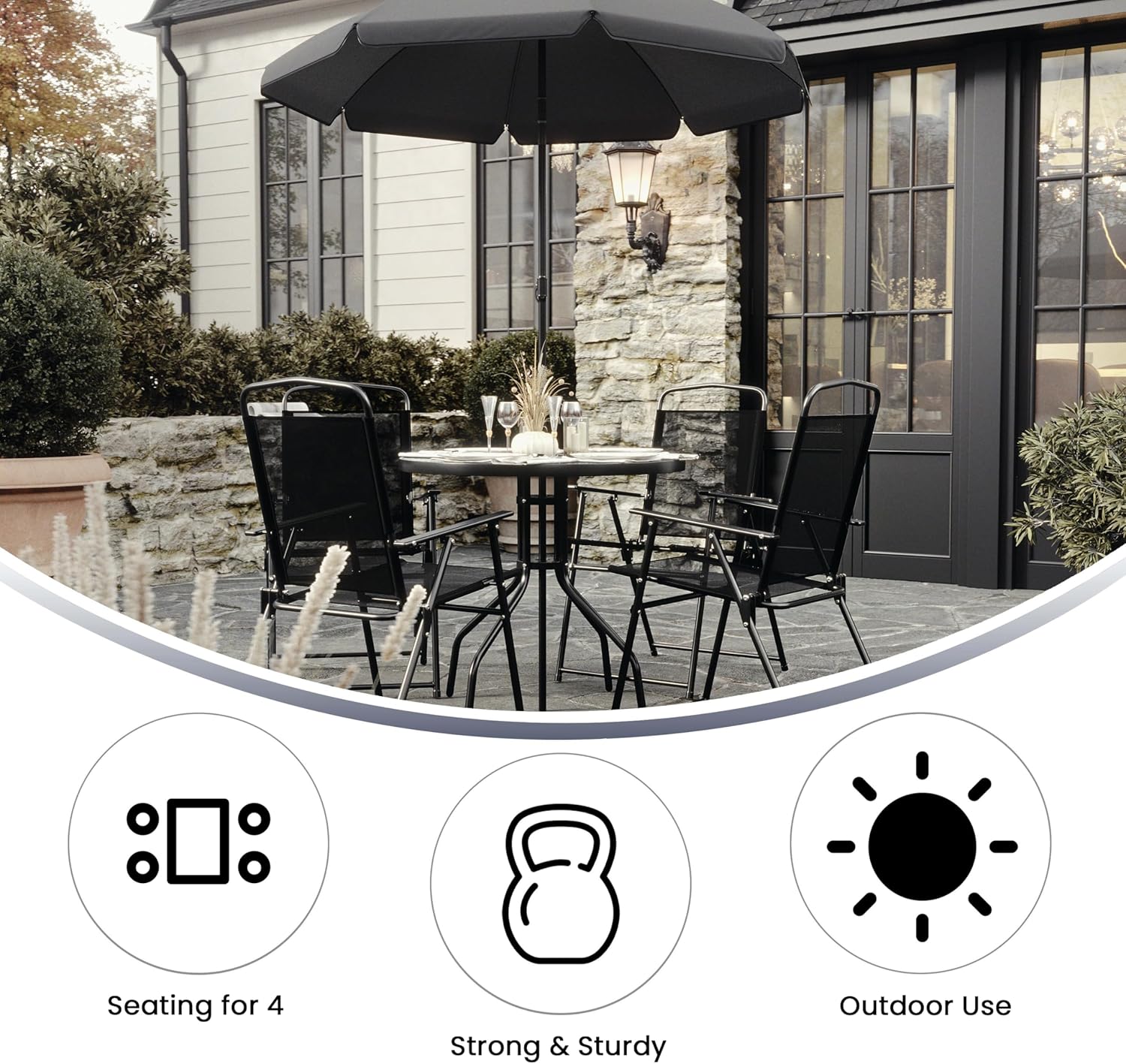 Zawiera szklany stół ogrodowy, 4 składane krzesła i parasol ogrodowy, które przekształcą każde patio, podwórko, werandę lub taras z nudnego w atrakcyjny i ułatwią relaks lub rozrywkę