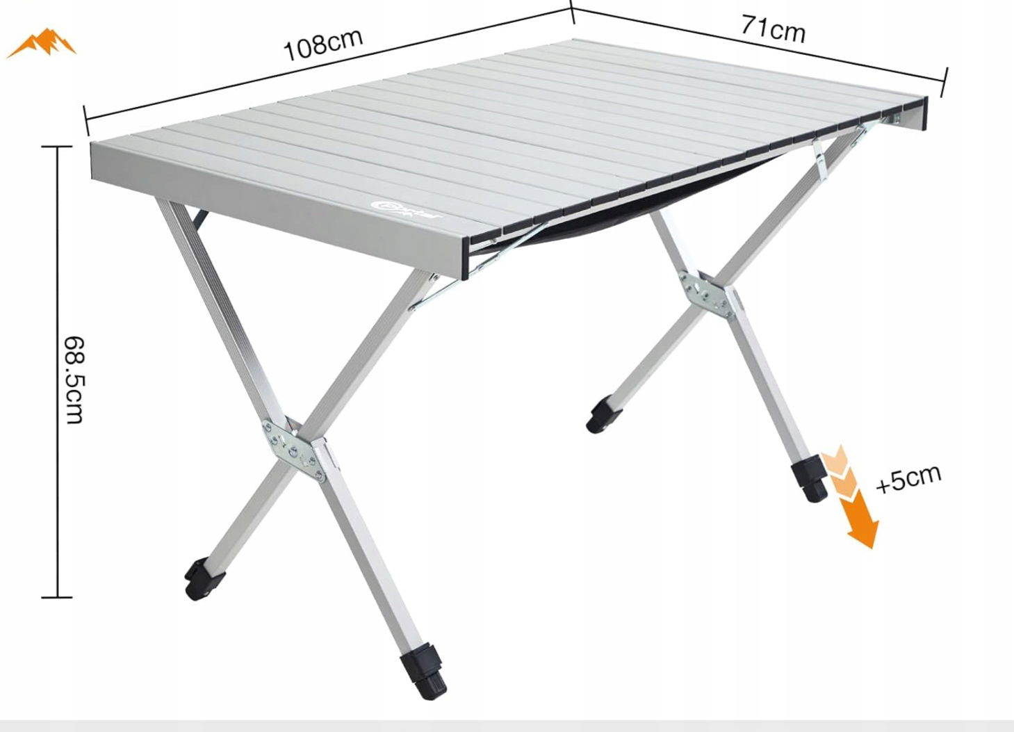 Dzięki regulowanym nogom, stół można dostosować do nierówności terenu, co zapewnia stabilność. Jest składany, lekki (5,4 kg), a jednocześnie wytrzymały - do 100 kg obciążenia.