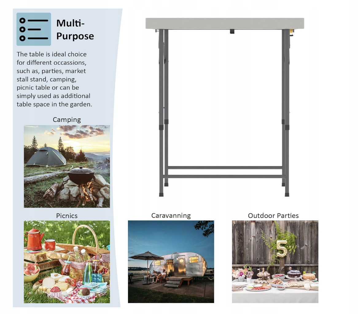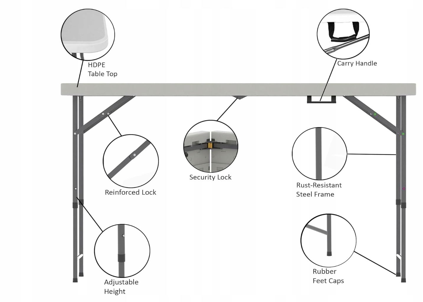 Home Vida oferuje ten oszałamiający produkt o nowoczesnym, stylowym designie, składany stół 1,2 m. Ten składany stół jest niezwykle wszechstronny, dzięki czemu idealnie nadaje się na każdą okazję lub okazję. Dzięki wytrzymałej, mocnej powierzchni stół ma ramę kradzieżową, nogi, które można zablokować, aby zwiększyć stabilność i przenośną konstrukcję. Ten stół składa się bez wysiłku i ma uchwyt do noszenia dla łatwego przenoszenia. Dzięki temu ten stół jest na kemping, imprezy, targ lub catering, jest idealny, ponieważ może być używany wewnątrz lub na zewnątrz. Ten stół ma górną grubość 4,5 cm i rozmiar rury 25 mm.
