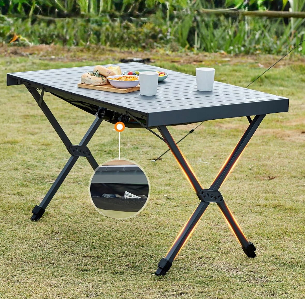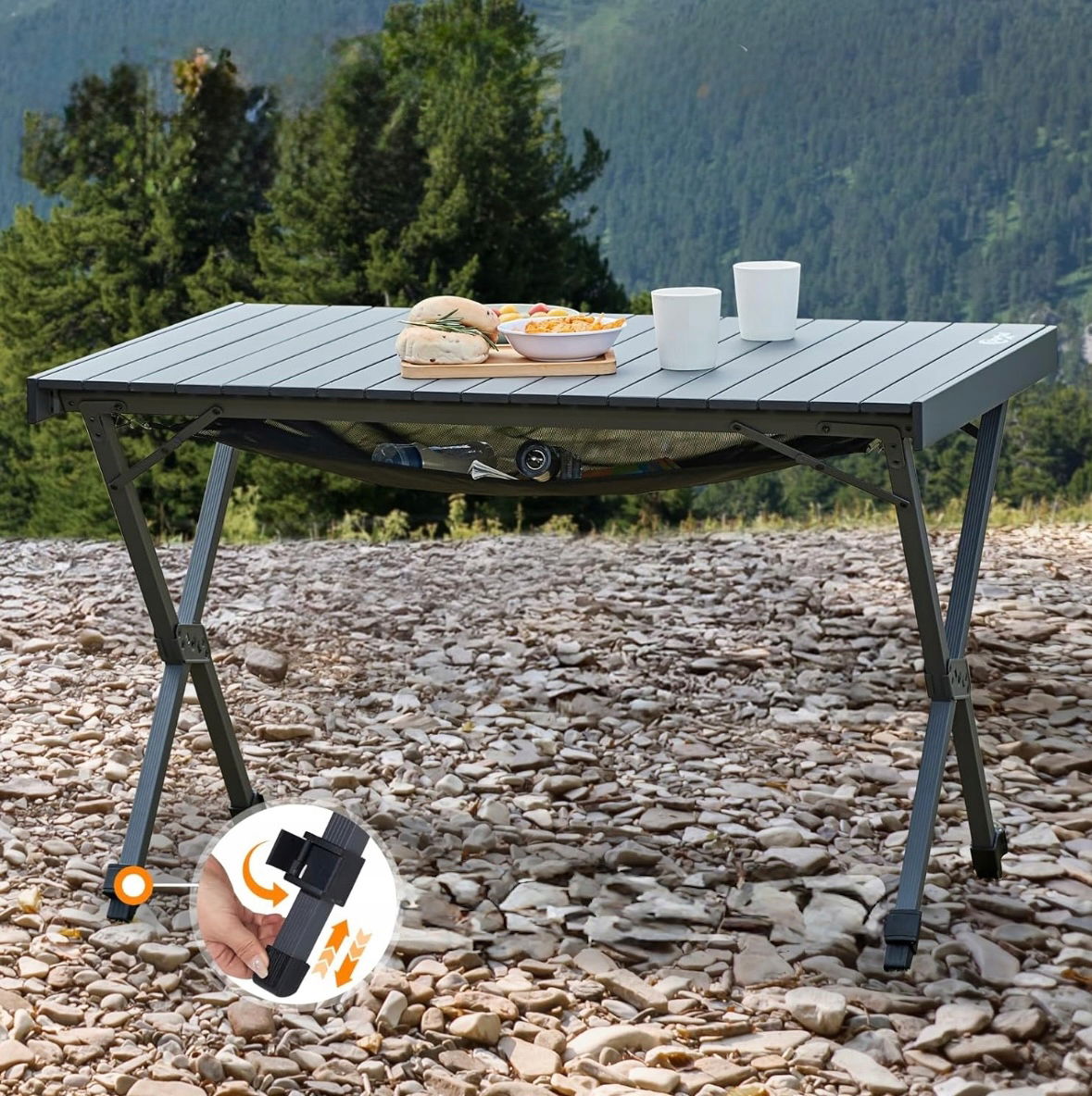 Lekka i wytrzymała konstrukcja aluminiowa pozwala na łatwy transport stołu o wadze 5,3 kg i nośności do 100 kg. Jego przestronny blat 108 × 71 cm idealnie nadaje się na rodzinne posiłki czy spotkania przy winie.
