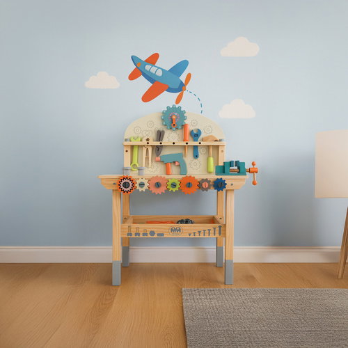 wzbudza zainteresowanie dzieci - drewniany warsztat to nie tylko zabawka, ale też edukacyjne narzędzie, które rozwija koordynację, wyobraźnię i zdolności manualne, każde dziecko znajdzie coś ciekawego od kręcenia imadłem po skręcanie śrubek