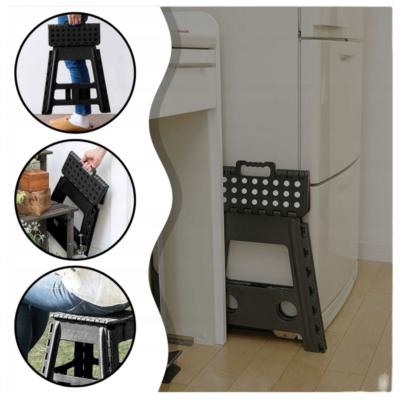 Taboret składany Czarny z uwagi na swoją funkcjonalność sprawdzi się w każdym domu. Taboret dzięki uniwersalności może być wykorzystywany przez dzieci, jak i dorosłych. Produkt będzie doskonały, jeśli masz problem z dostaniem się do produktów, które ustawione są na wysokich i niedostępnych dla Twojego wzrostu półkach. W przypadku młodszych dzieci idealnie nada się jako taborecik, dzięki którym dostanie się do niedostępnych i wyższych mebli.