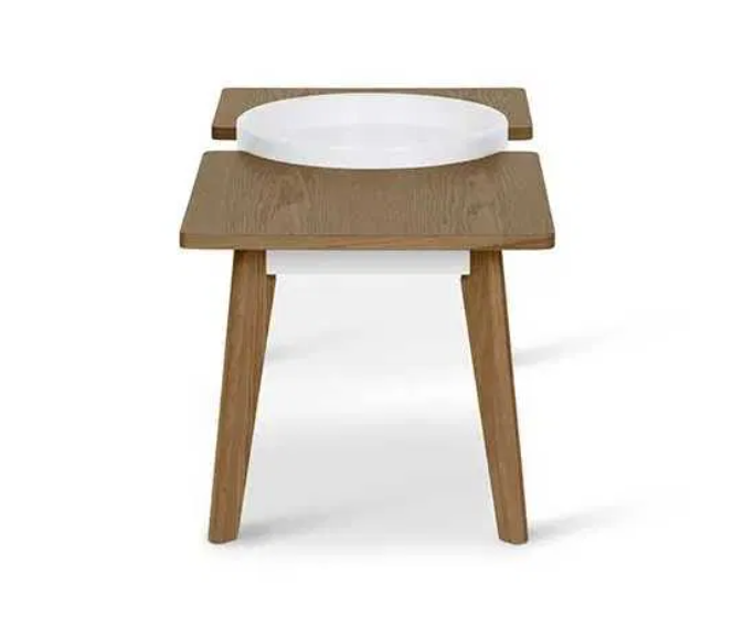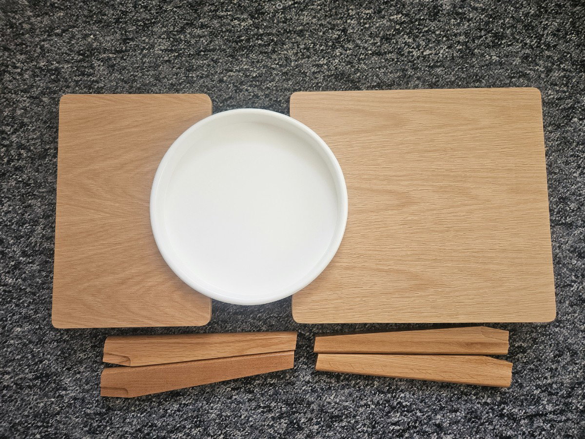 - Materiał: lite drewno dębowe + taca z tworzywa sztucznego