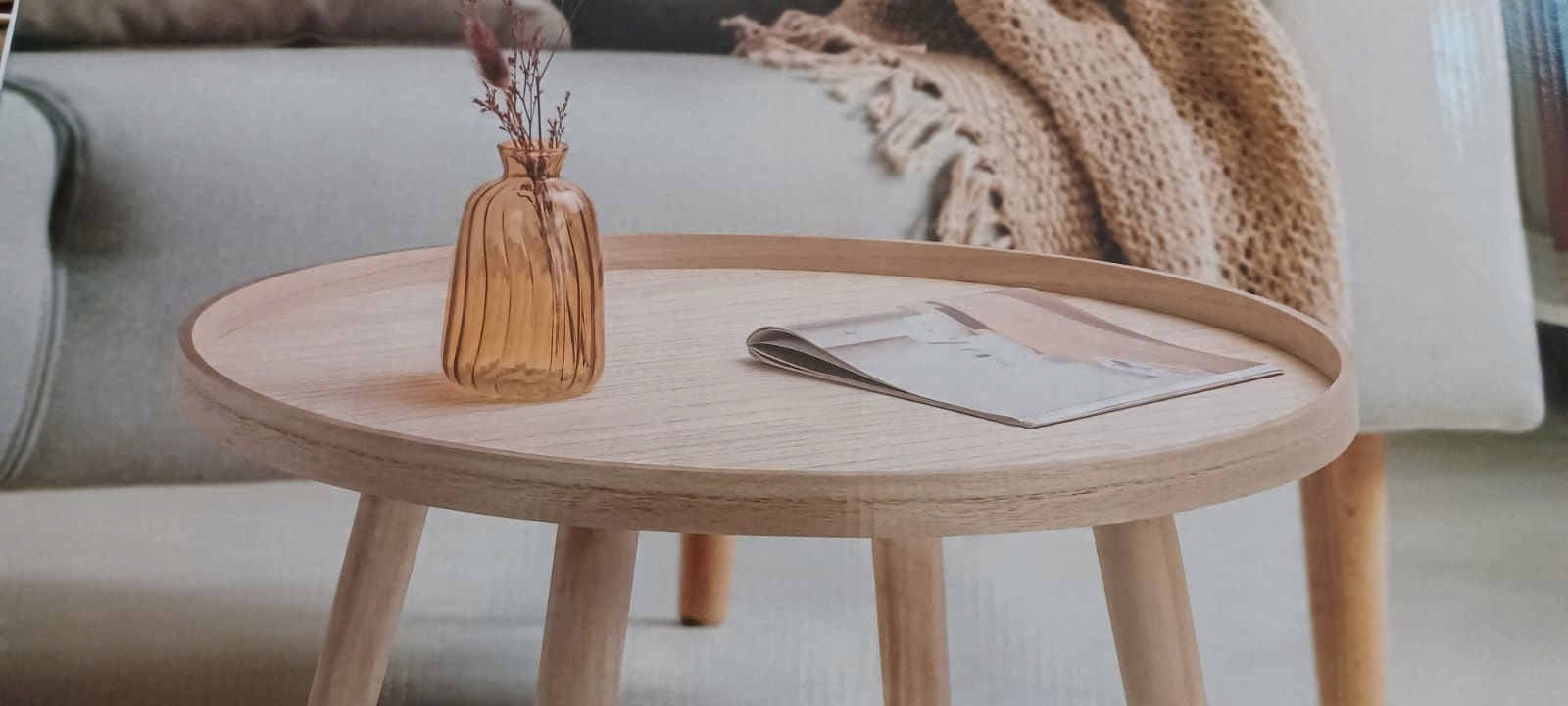 Drewniany stolik do salonu z podwyższona krawędzią i 4 nóżkami nie tylko bardzo gustownie wygląda, lecz także idealnie nadaje się do ustawienia na nim rośliny, dekoracji lub po prostu szklanki z napojem.