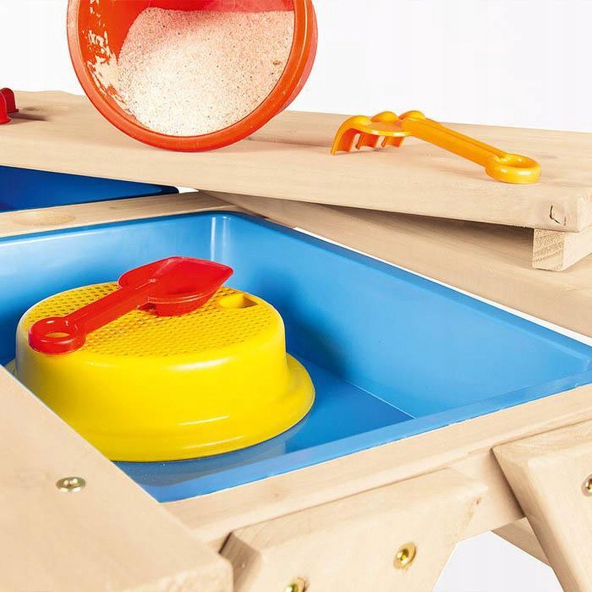 - Dwufunkcyjność: Blat stolika jest zdejmowany, co pozwala schować pod nim pojemniki (tacki) – idealne do przechowywania piasku, zabawek, kredek.