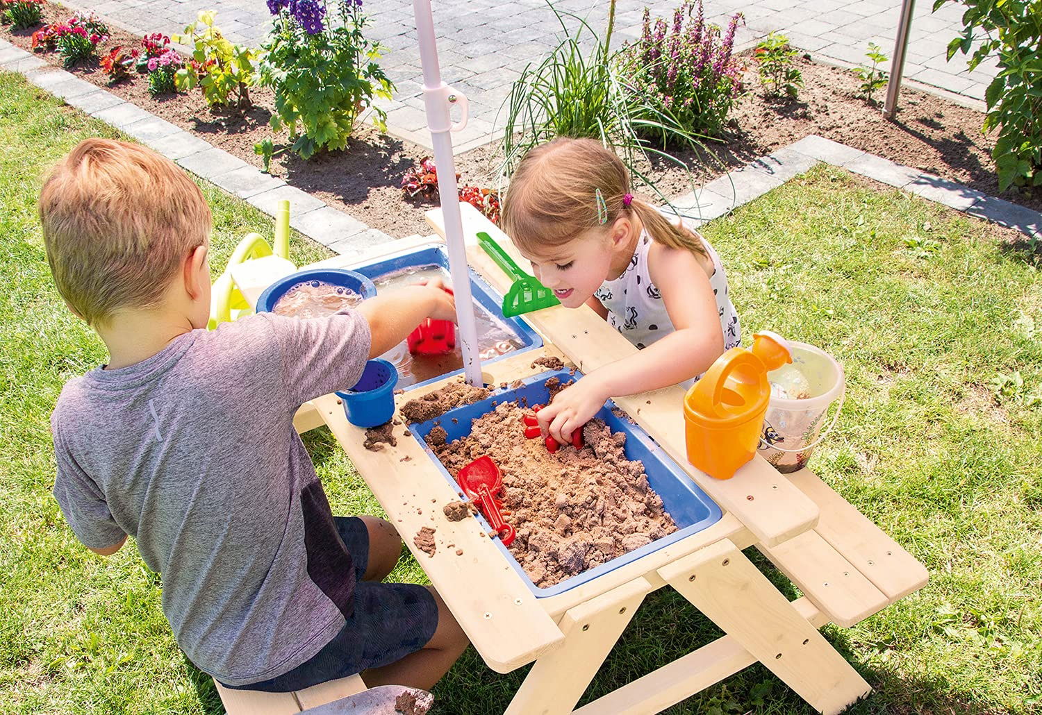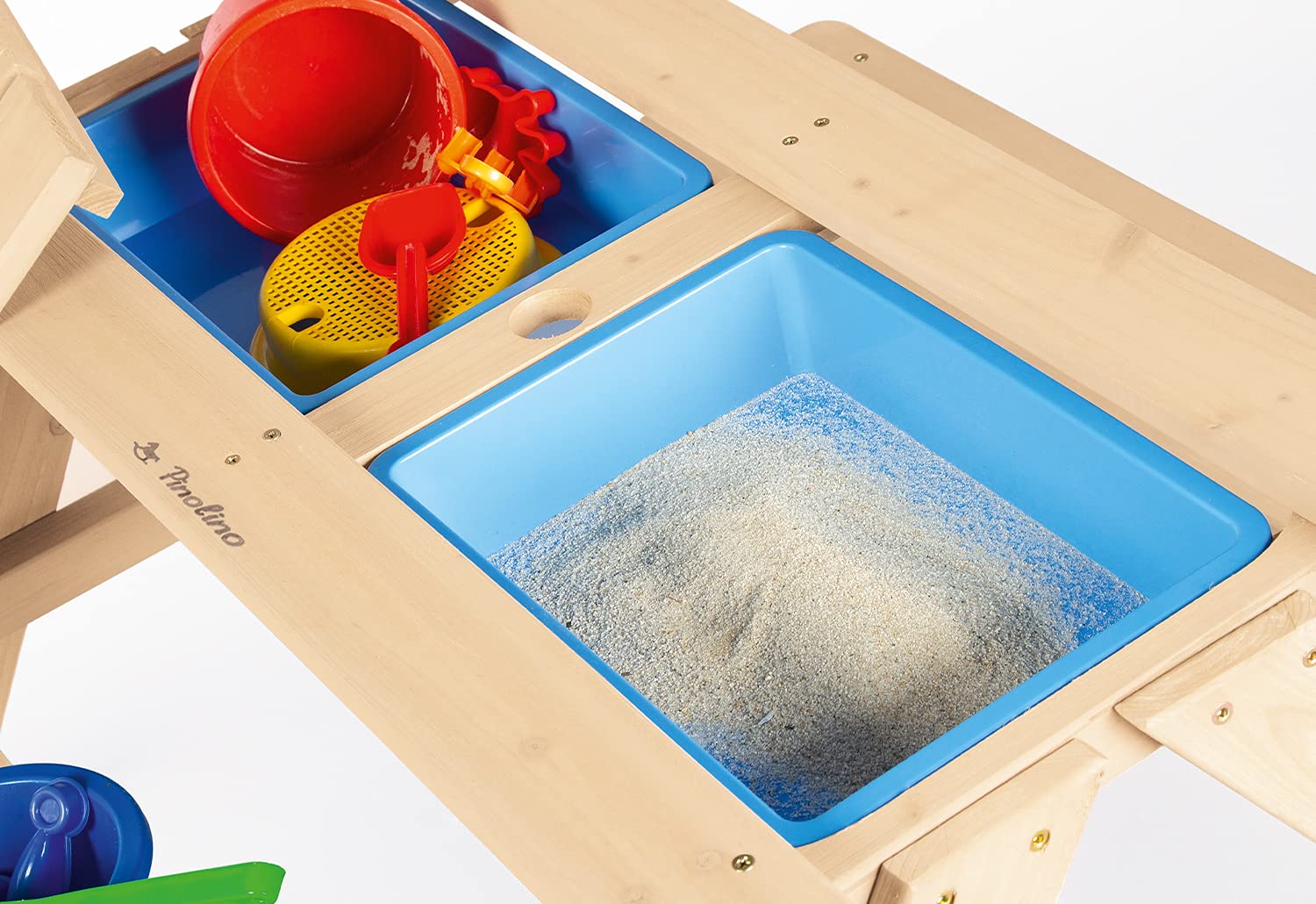 - Pojemniki: W zestawie 2 pojemniki z tworzywa (ok. 4 l każdy), które można wykorzystać jako „skrzynie” na zabawki lub piasek.
