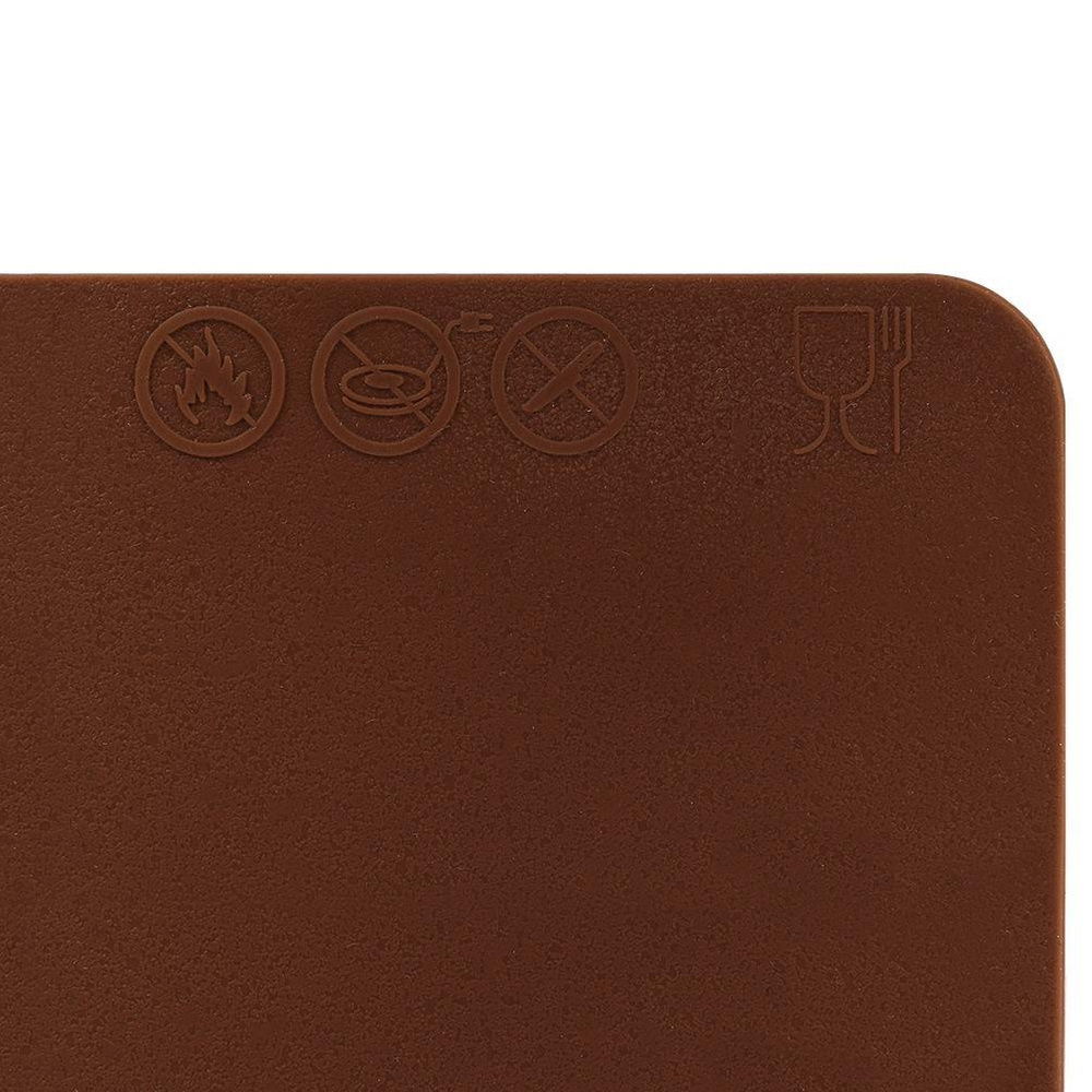 Nowoczesna, brązowa stolnica silikonowa, z jednej strony wyposażona w powłokę zapobiegającą przywieraniu, a z drugiej zapobiegającą przesuwaniu się maty, dzięki czemu świetnie trzyma się blatu. Mata jest idealna do wyrabiania ciast, ciasteczek, pizzy. Całkowicie bezpieczna dla zdrowia i neutralna dla żywności. Do wykrawania nie należy używać ostrych noży, może to uszkodzić stolnice.