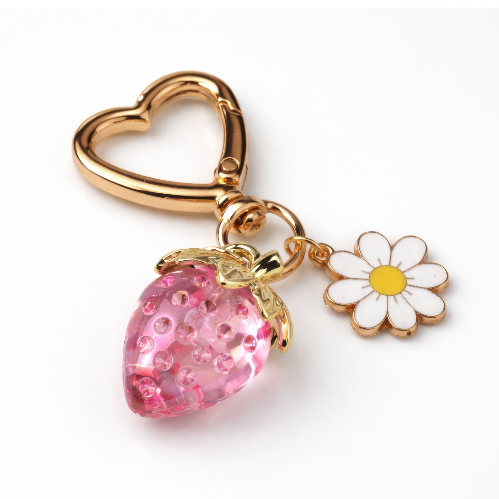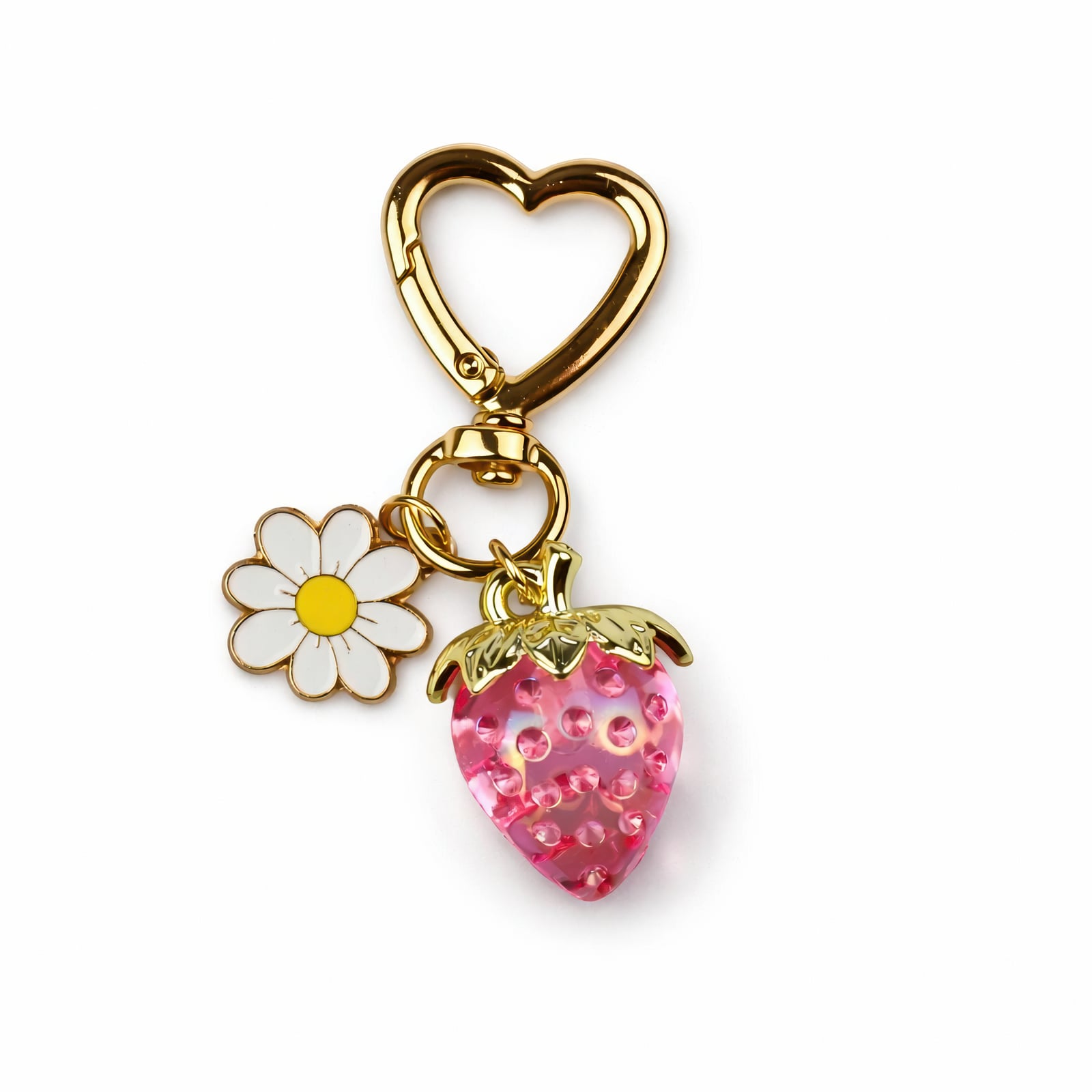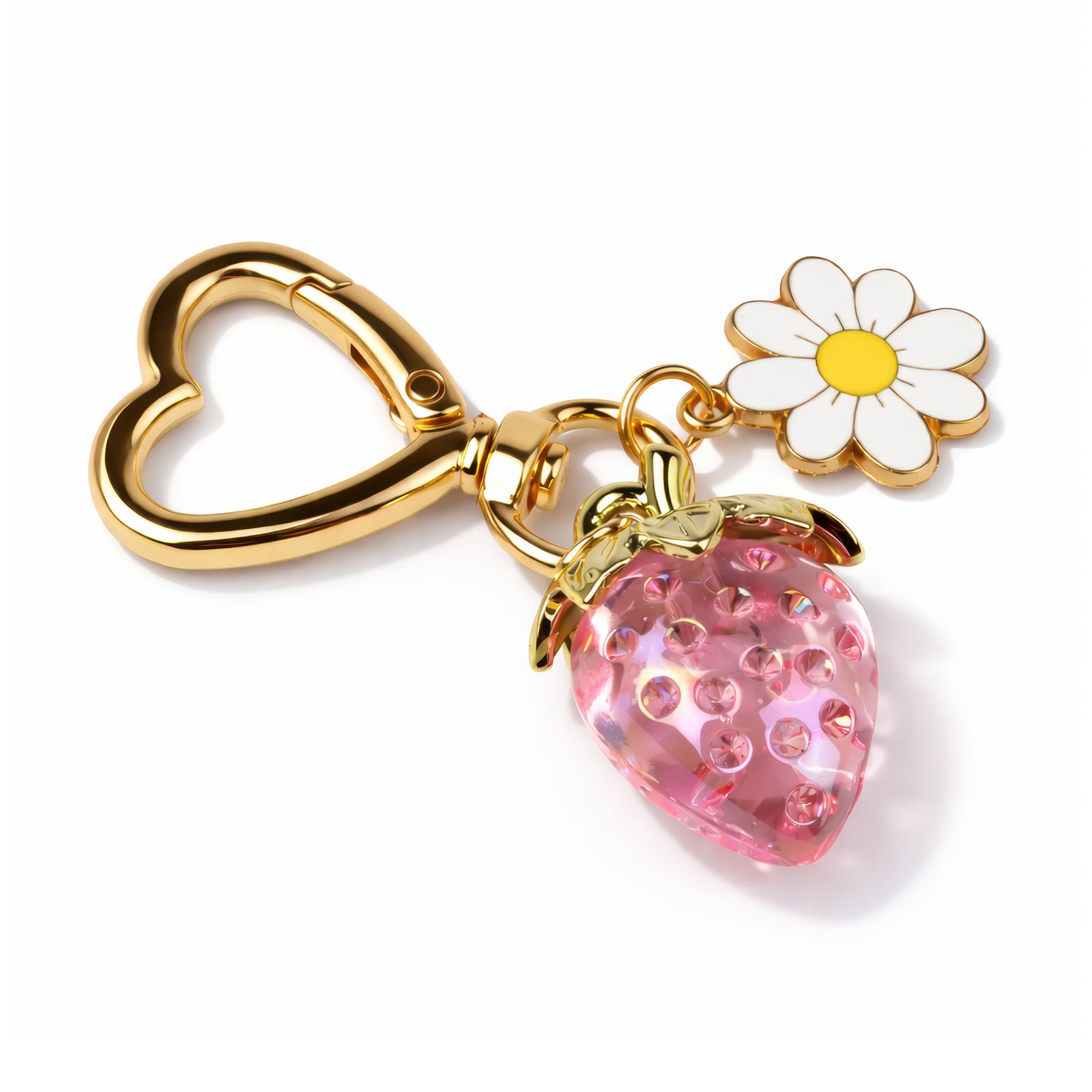 Kapryś spotyka się z blaskiem w tym 6-centymetrowym breloczku, który sprawia wrażenie kąska letniego słońca. Przezroczysta różowa truskawka, wykonana z gładkiego akrylu, zwisa z haczyka w kształcie serca w odcieniu złota. Drobne, przypominające kryształki nasionka są osadzone w owocu, łapiąc światło przy każdym obrocie klucza. Delikatny charms z stokrotką – białymi płatkami i słonecznym żółtym środkiem – dzieli ten sam pierścień, dodając świeży, prosto z ogrodu akcent. Polerowane złoto metalu haczyka, łączników i listków truskawki tworzy uderzający kontrast z żywym owocem, a subtelny kształt serca dodaje nutkę romantyzmu. Idealny dla każdego, kto kocha zabawną, kobiecą biżuterię, która jest zarówno urocza, jak i odrobinę luksusowa.