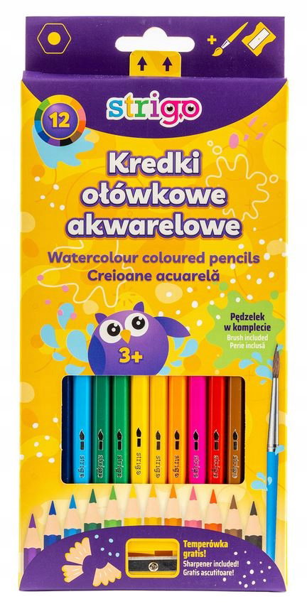 Zestaw 12 ołówkowych kredek akwarelowych, posiadających wewnętrzny wodorozcieńczalny i wilgotny pigment. Wykonane z miękkiego drewna lipowego o sześciokątnym kształcie, pozwalają na kreślenie cienkich linii z niezwykłą lekkością. Posiadają wewnątrz mocny grafit o grubości 3,0 mm. Idealnie sprawdzą się podczas rysowania drobnych elementów oraz szkicowania. Posiadają w swoim zestawie pędzelek.