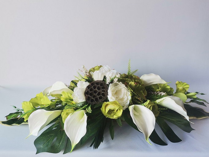 Oferujemy stroiki na nagrobki STROIK KALIE – RÓŻA – HORTENSJA BIEL – ZIELEŃ PŁOŻĄCY. Wymiar stroika 90 cm x 40 cm x 25 cm . Wykonanie z wysokiej jakości kwiatów. Kwiaty odporne na warunki atmosferyczne. Możliwość zmiany koloru kwiatów. Możliwość dołączenia do stroika serca z napisem grawerowanym.