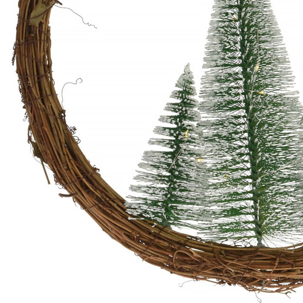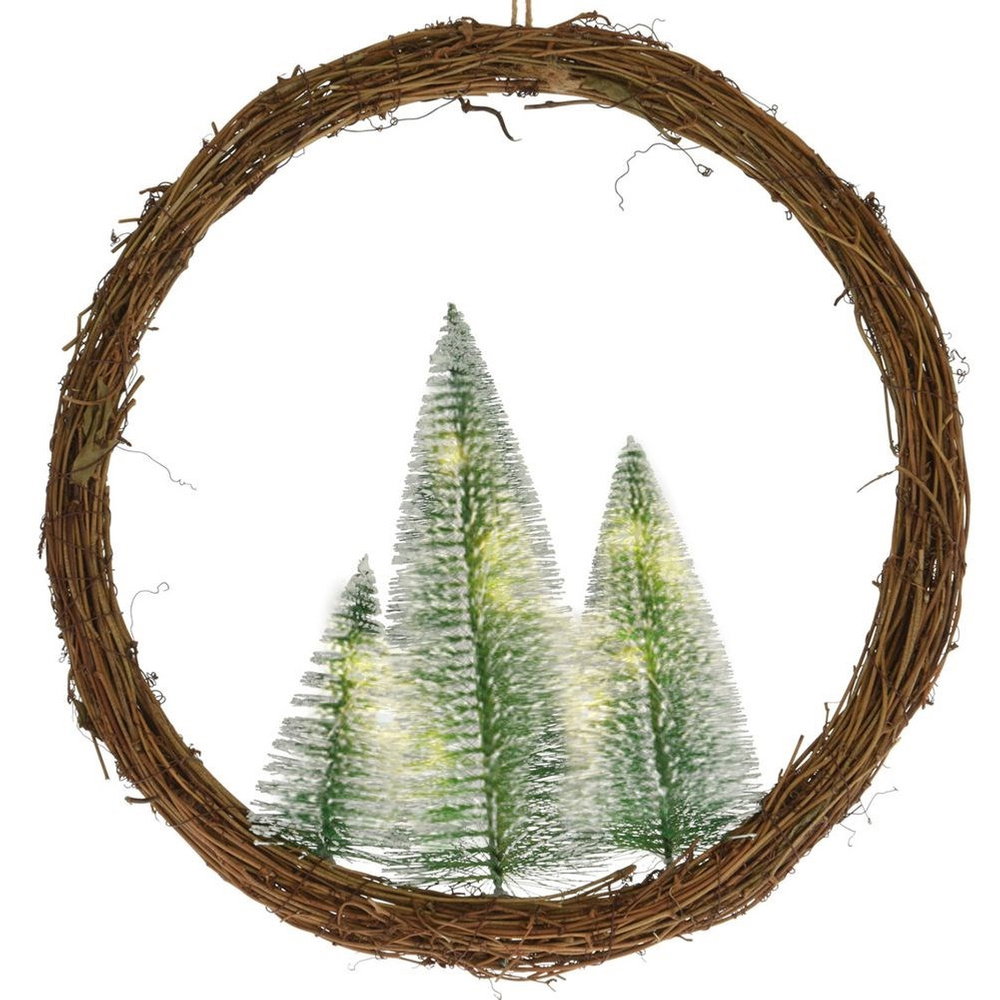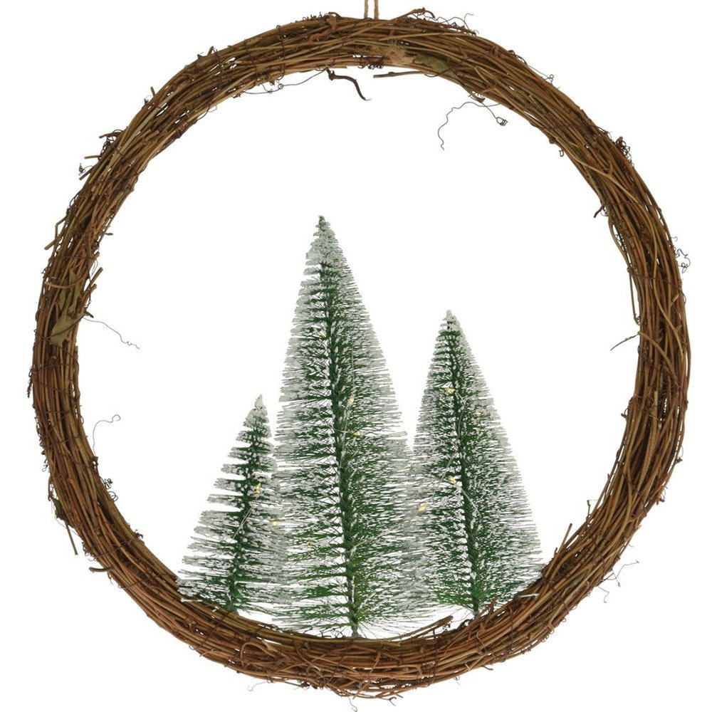 EFEKTOWNY - Obręcz stroika wykonana z rattanu w brązowym kolorze. Wewnątrz znajdują się trzy choinki wykonane z tworzywa w kolorze zielonym z efektem ośnieżenia. Całość tworzy niepowtarzalny efekt.