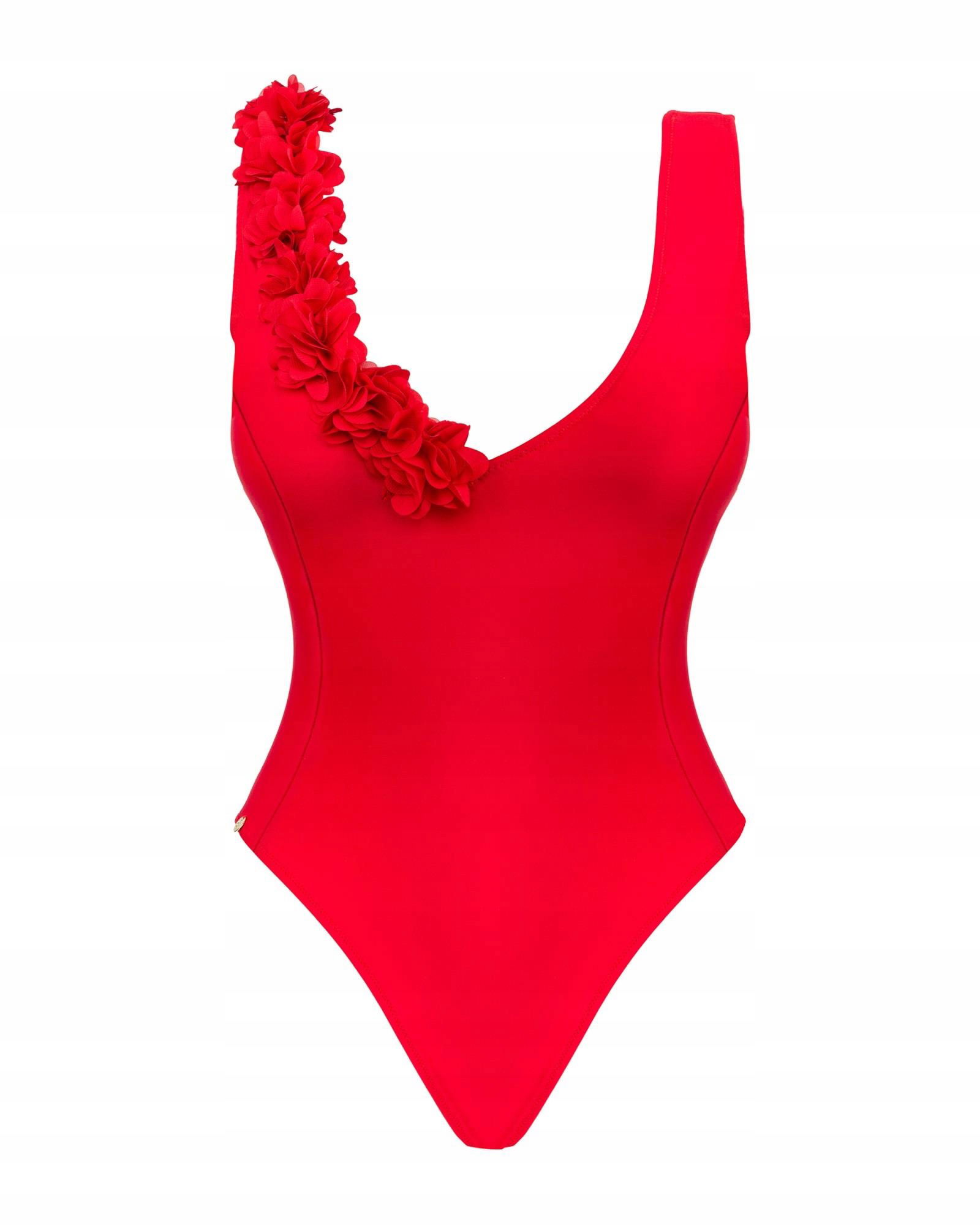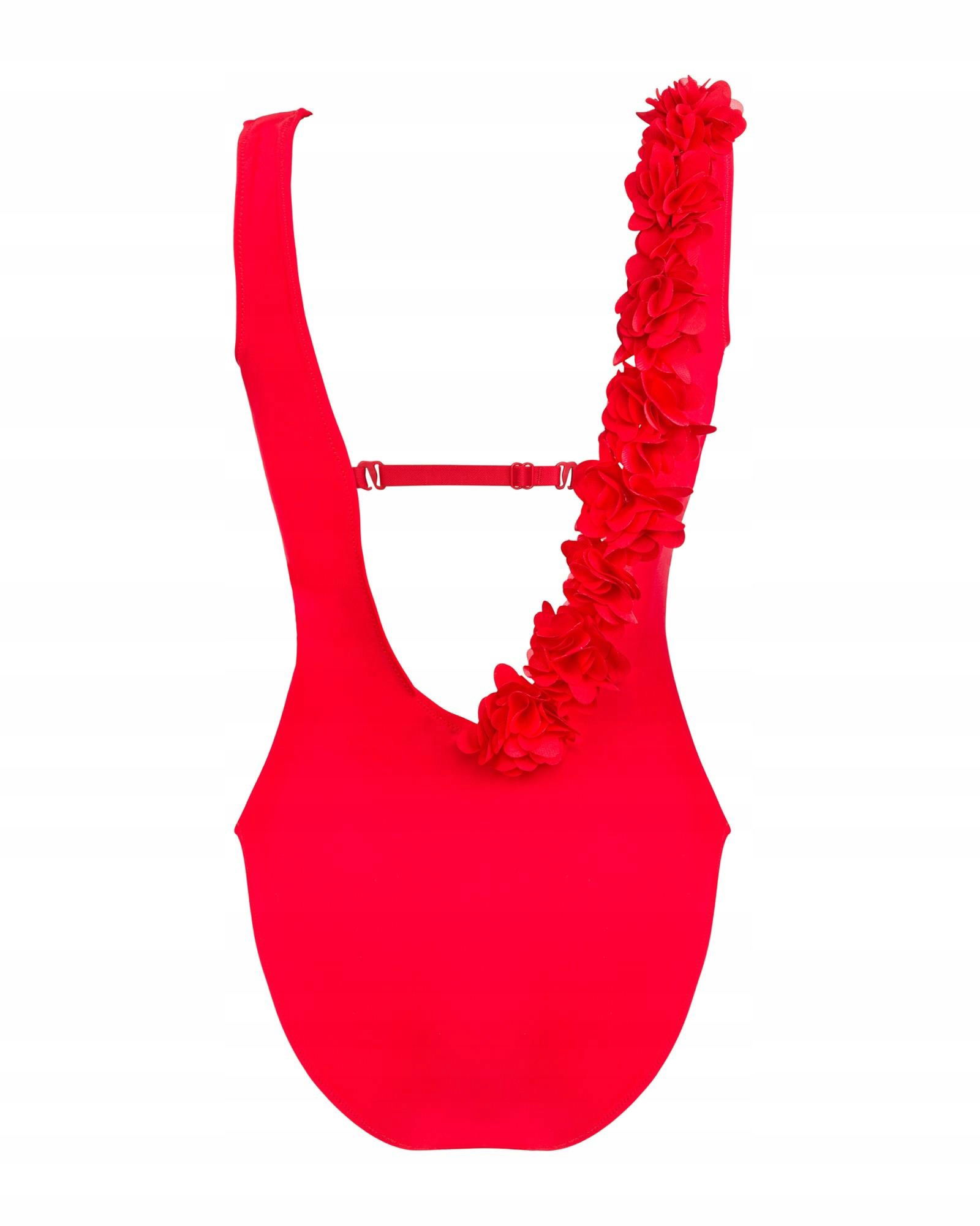 Bardzo kobiecy, czerwony kostium kąpielowy. Kwiatowy element, dodający dziewczęcego uroku, w połączeniu z głęboko wyciętym dekoltem to zaskakujące i jednocześnie ciekawe zestawienie. Ozdoba sięga od biustu, aż po linię pośladków, a wysoko wycięta linia bioder idealnie wysmukla sylwetkę. Kostium Cubalove w zestawieniu ze spodniami lub zwiewną spódnicą będzie także wyjątkowym elementem w letniej, a nawet wieczorowej stylizacji.