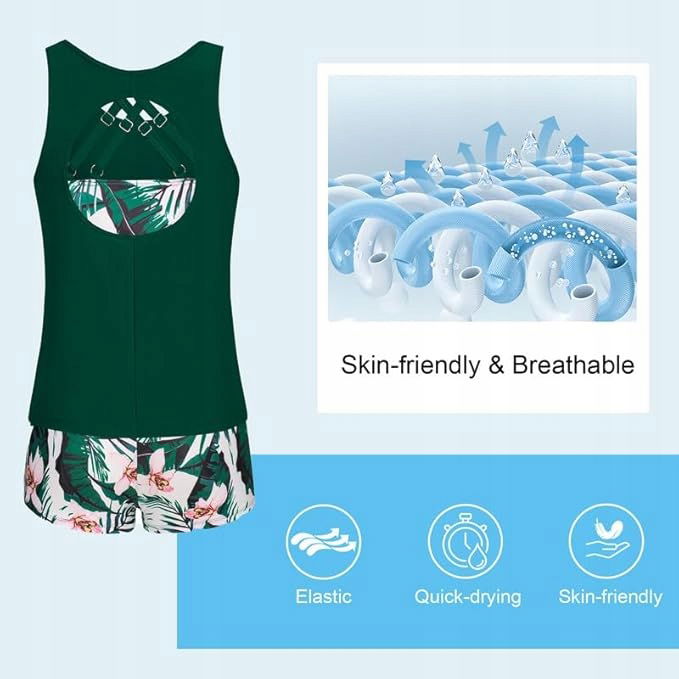 Praktyczny trzyczęściowy kostium kąpielowy tankini składa się z trzyczęściowego kostiumu kąpielowego, składającego się z górnej części z odkrytymi plecami, sportowego biustonosza bikini i kąpielówek. Można go używać jako bikini lub jako topu tanini. Luźna bluzka Gini zakrywa brzuch, jest modna i ma wszechstronne zastosowanie.