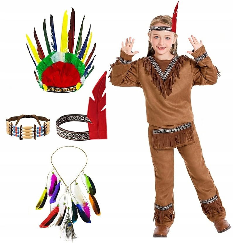 Kompletny zestaw Indianki: odkryj nieoczekiwane wrażenia dzięki naszemu kostiumowi Indianki, który zawiera 1x pióropusz, 1x opaska z piórkiem, 1x bransoletka, 1x opaska z piórami na głowę, 1x koszulkę Indiańską oraz 1x spodnie Indiańskie