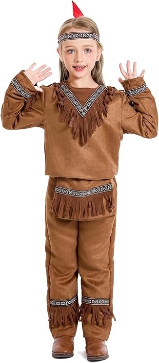 Velmawig Kostium indiański dla dzieci, dziewczynki, chłopca, top spodnie z akcesoriami, kostium karnawałowy, kostium indiański, dla dzieci, kostium Cosplay z nakryciem głowy, naszyjnik