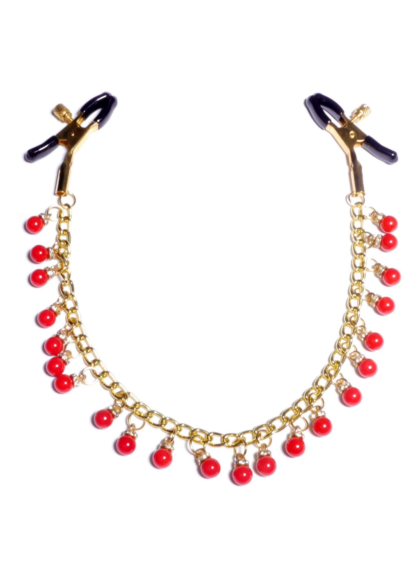 Wytrzymałe metalowe zaciski pokryte miękką gumą, te zaciski są idealne dla początkujących jak i entuzjastów. Siłę zacisku brodawki można regulować obracając śrubę, Elegancki łańcuszek z małymi zdobieniami łączy oba sutki, daje to niesamowitą stymulację przy każdym ruchu.