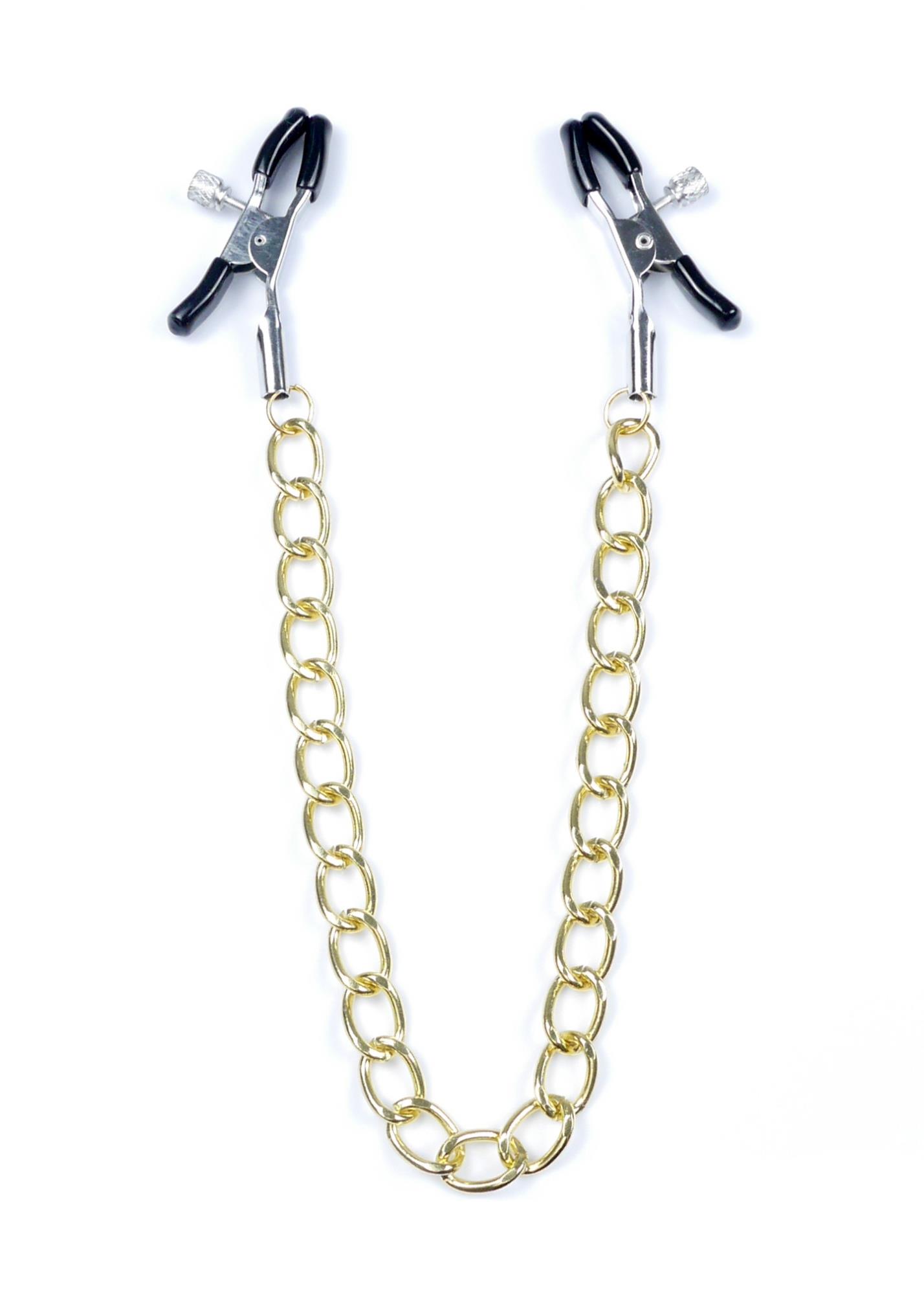 Wytrzymałe metalowe zaciski pokryte miękką gumą, te zaciski są idealne dla początkujących jak i entuzjastów. Siłę zacisku brodawki można regulować obracając śrubę, Elegancki łańcuszek łączy oba sutki, daje to niesamowitą stymulację przy każdym ruchu.
