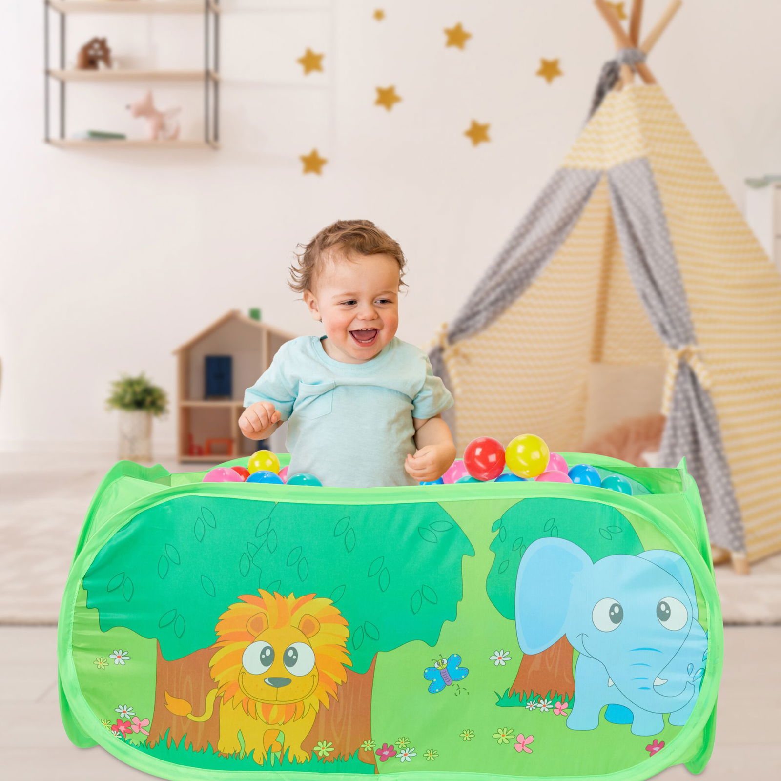 Nasz samorozkładający suchy basen z kulkami rozkłada się w mgnieniu oka, a gwarantuje dziewczynkom i chłopcom wiele godzin prawdziwej frajdy. Małe dzieci i niemowlęta od 6. miesiąca życia mogą bawić się kolorowymi piłkami, ćwicząc przy tym umiejętność chwytania i koordynację oko-ręka. Ten mały basen z piłeczkami nie posiada zadaszenia, dzięki czemu możesz mieć swoją pociechę zawsze na oku. Dziecięcy design i uroczy motyw graficzny w postaci zwierzątek pasuje idealnie do pokoju dziecka, lecz zachwyca również dorosłych.