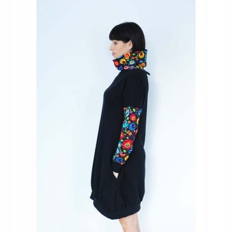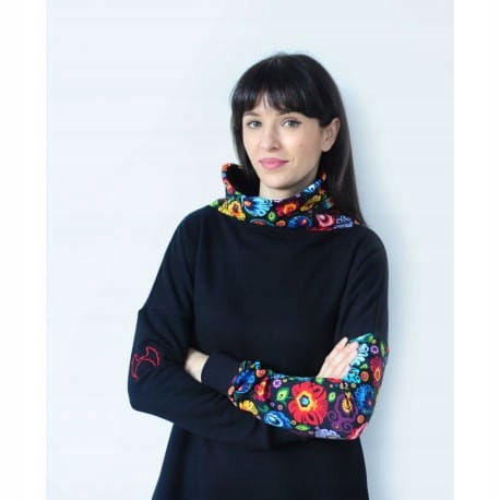 Sukienka folkowa z golfem i łowickim wzorem to wyjątkowa propozycja, łącząca funkcjonalność z tradycyjną estetyką polskiego folkloru. Wykonana z czarnej bawełny, sukienka posiada luźny krój, który zapewnia komfort i swobodę ruchów. Duży golf z wykończeniem w łowickie wzory oraz folkowy rękaw nadają jej unikalnego charakteru. Wyposażona w kieszenie, sukienka jest idealnym wyborem na co dzień oraz na wyjątkowe okazje.