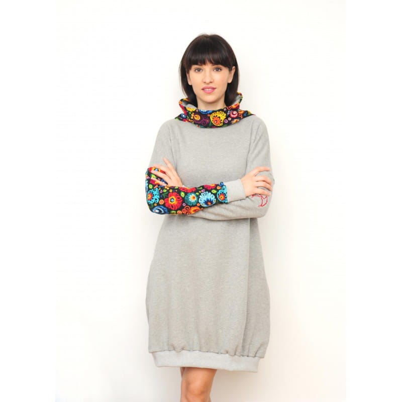 Sukienka folkowa z dużym golfem i łowickim wzorem na szarym tle to stylowa i wygodna propozycja, idealna na różne okazje. Wykonana z wysokiej jakości bawełny z domieszką lycry, sukienka zapewnia komfort noszenia i elastyczność. Duży golf, wykończony od wewnątrz łowickim wzorem, oraz jeden rękaw w ludowej tkaninie dodają jej unikalnego charakteru, łącząc współczesny design z tradycyjnymi polskimi motywami.