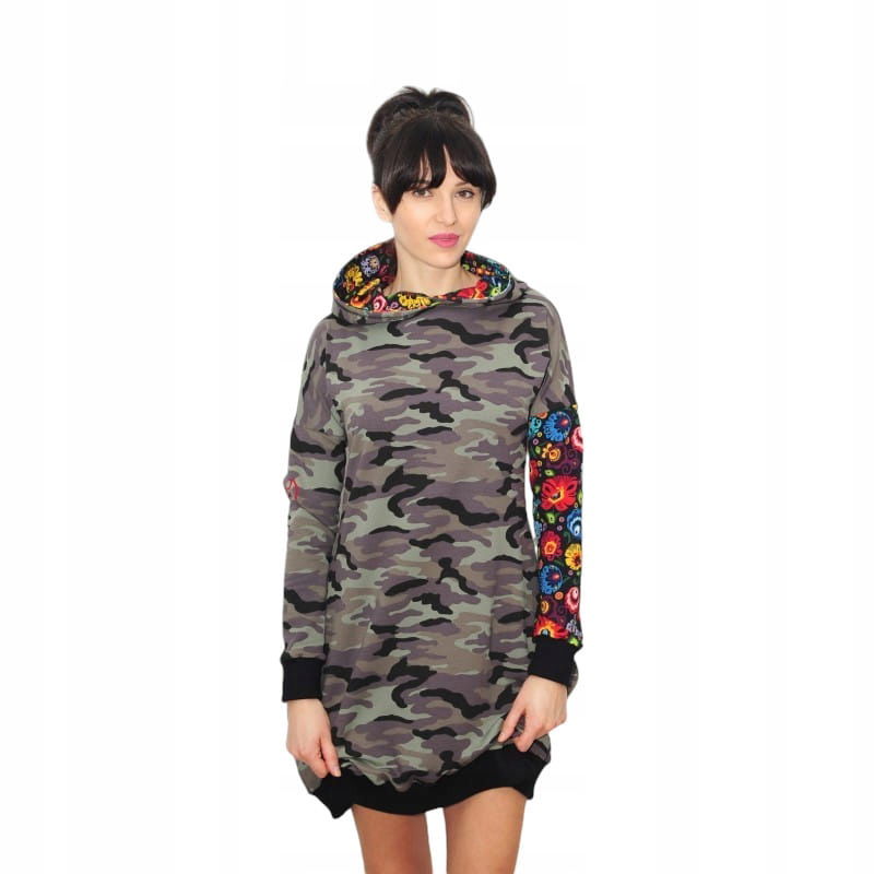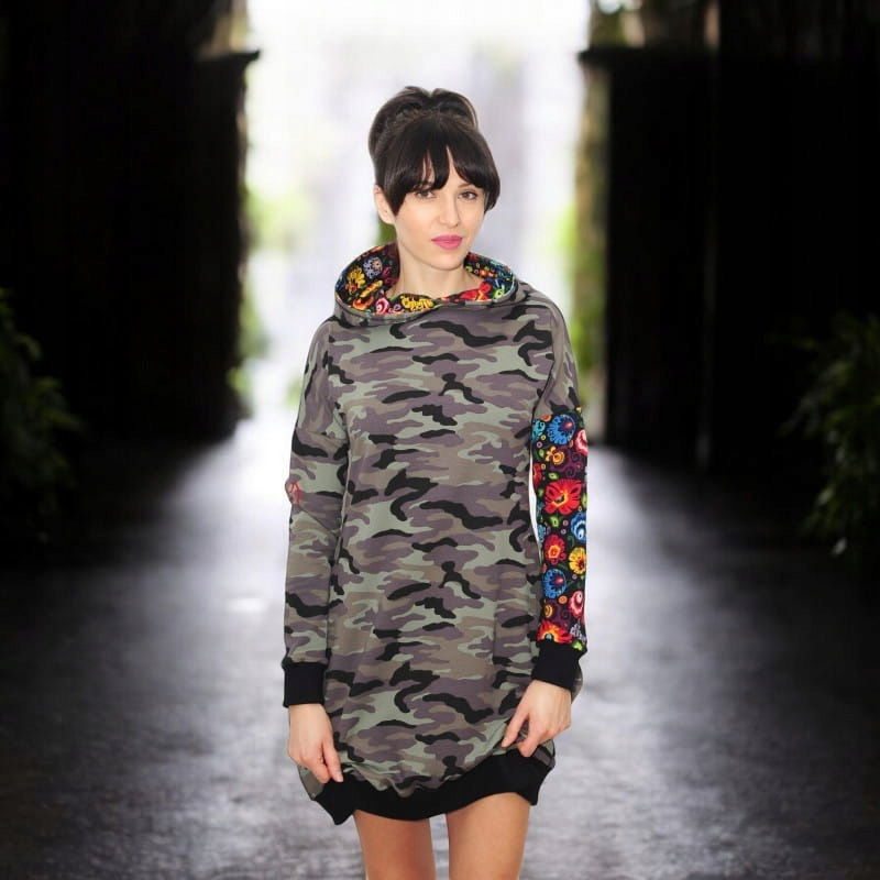 Wyjątkowa sukienka z dużym golfem została uszyta z miękkiej i komfortowej bawełny pętelkowej, która zapewnia wygodę noszenia przez cały dzień. Luźny krój sprawia, że sukienka doskonale dopasowuje się do sylwetki, jednocześnie gwarantując pełną swobodę ruchów. Zewnętrzna strona golfu oraz jeden z rękawów wykonane są z tej samej, dekoracyjnej tkaniny, która dodaje sukience oryginalnego charakteru.