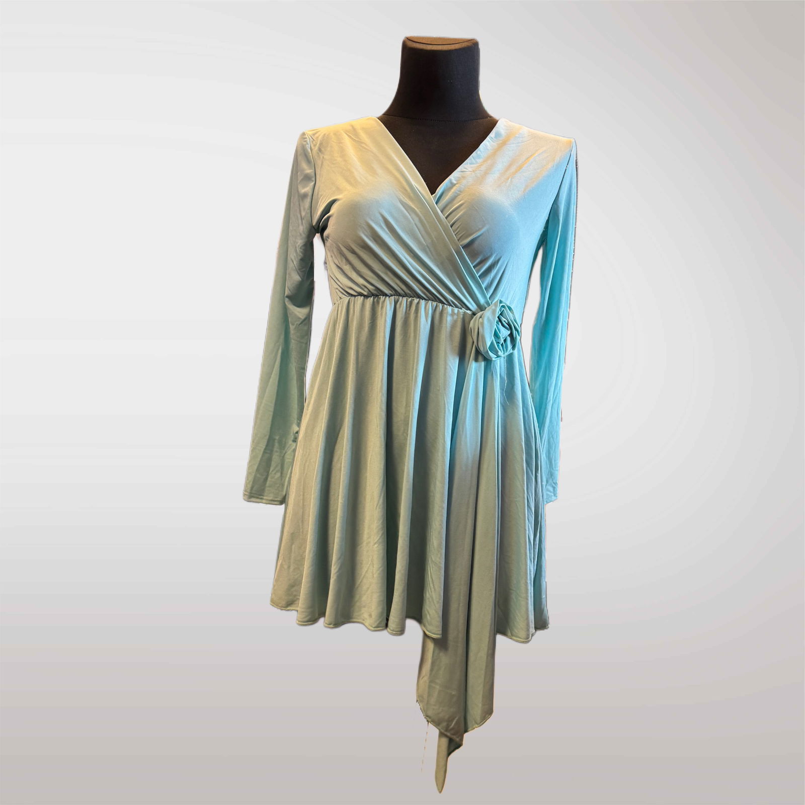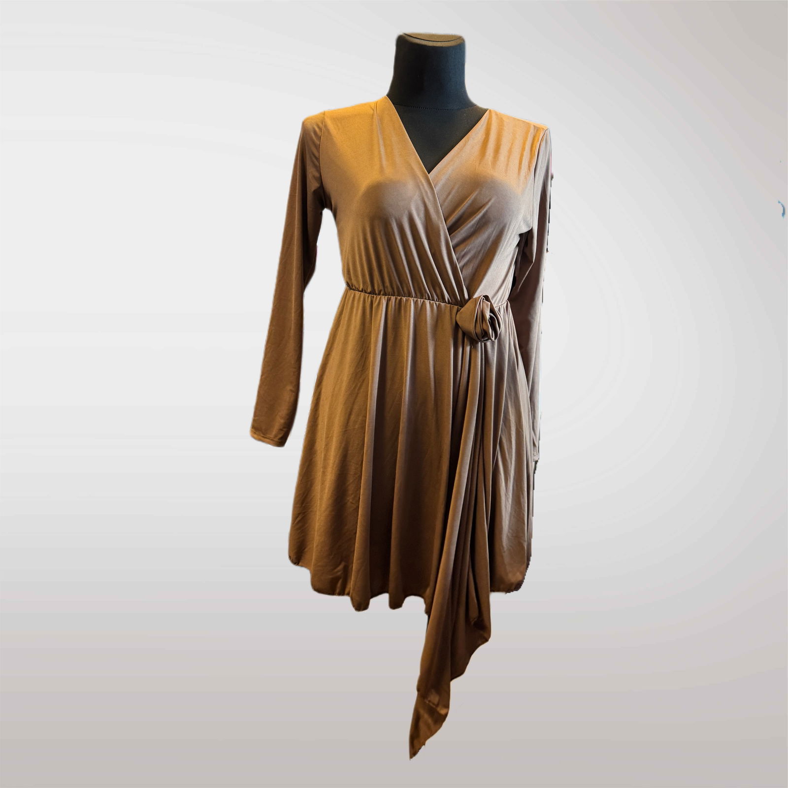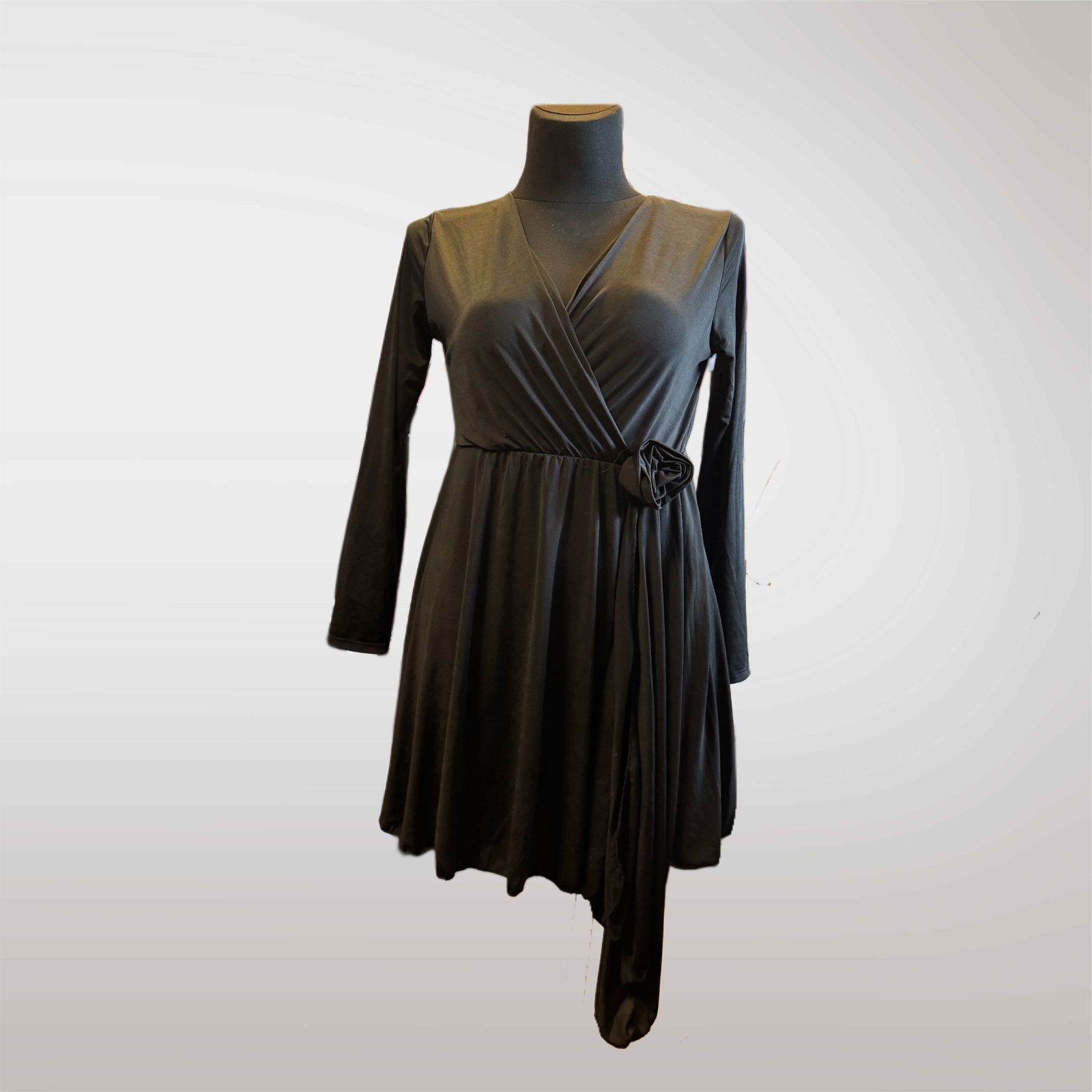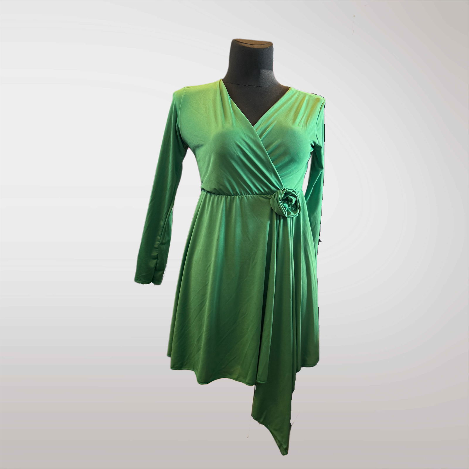 Elegancka sukienka z kopertowym dekoltem, która łączy styl i wygodę. Wykonana z lekkiego, przewiewnego materiału, doskonale dopasowuje się do sylwetki, podkreślając kobiece kształty. Asymetryczny dół dodaje jej wyjątkowego charakteru, a ściągacz w telli z kwiatem stanowi stylowy akcent.