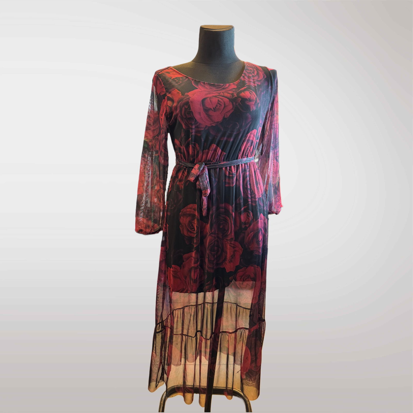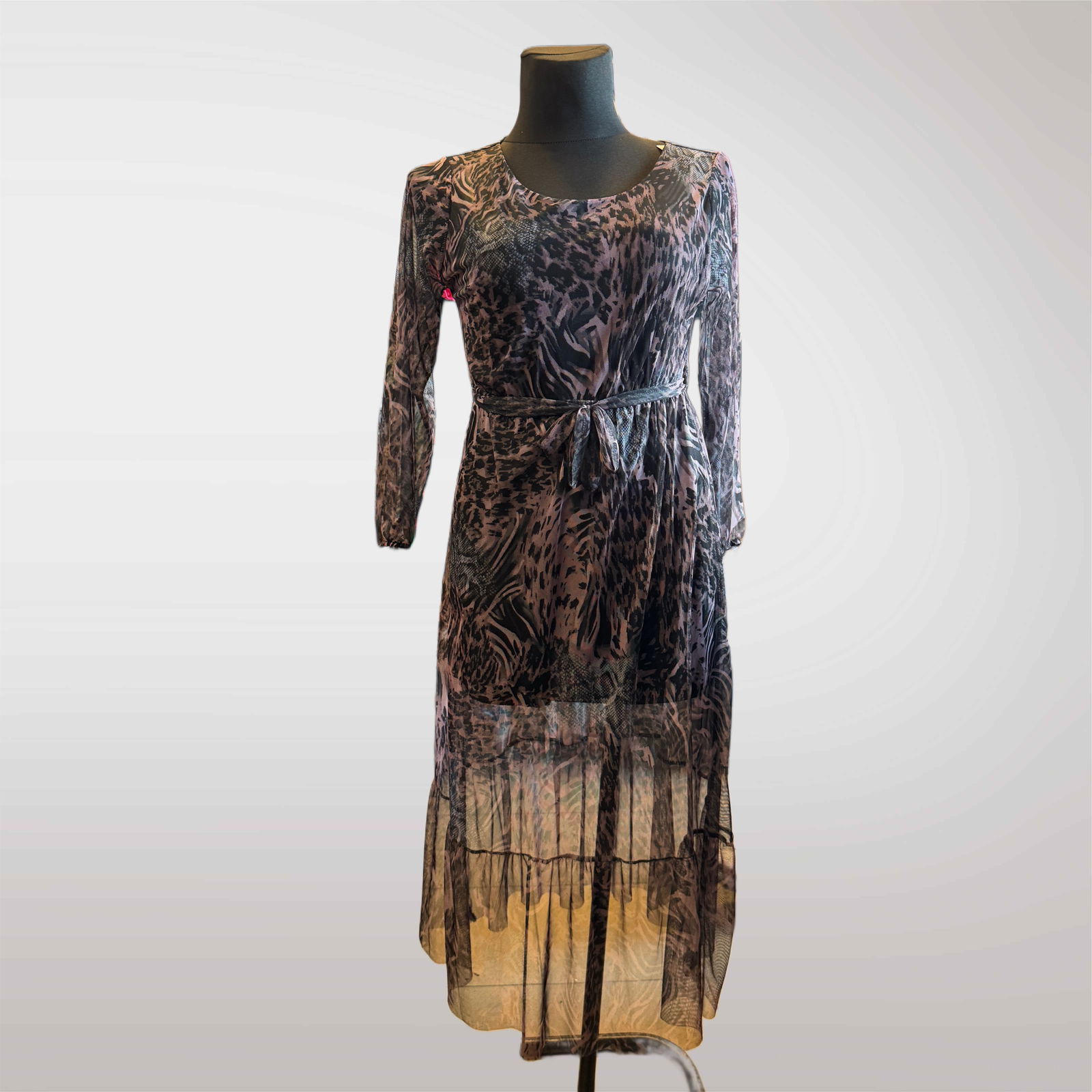 Lekka, kobieca półprzezroczysta sukienka z podszewką ze wzorem to doskonały wybór na każdą okazję. Dopasowany fason z elastycznym paskiem w talii podkreśla sylwetkę, a długie rękawy dodają elegancji.