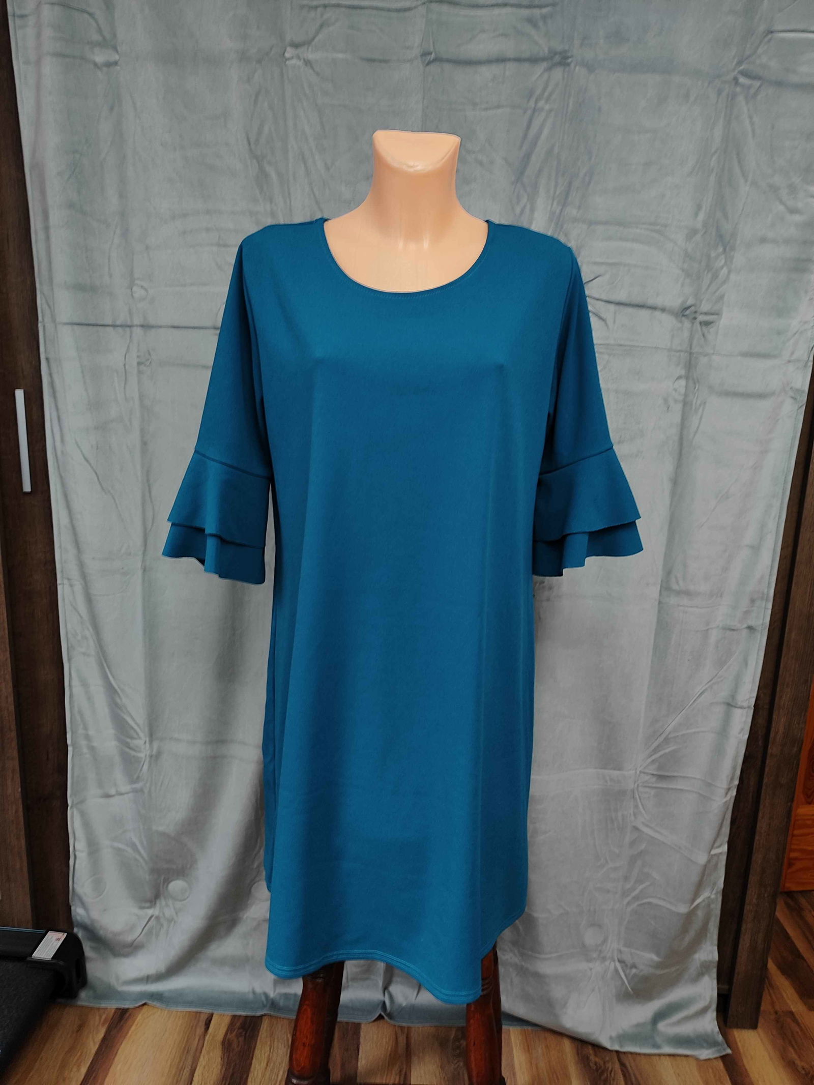 Luźniejszy, komfortowy fason z efektownymi rękawami z falbaną. Materiał lekko elastyczny, dobrze układa się na sylwetce i nie krępuje ruchów. Idealna na wesele, komunię, rodzinne uroczystości, ale też do pracy czy na kolację.