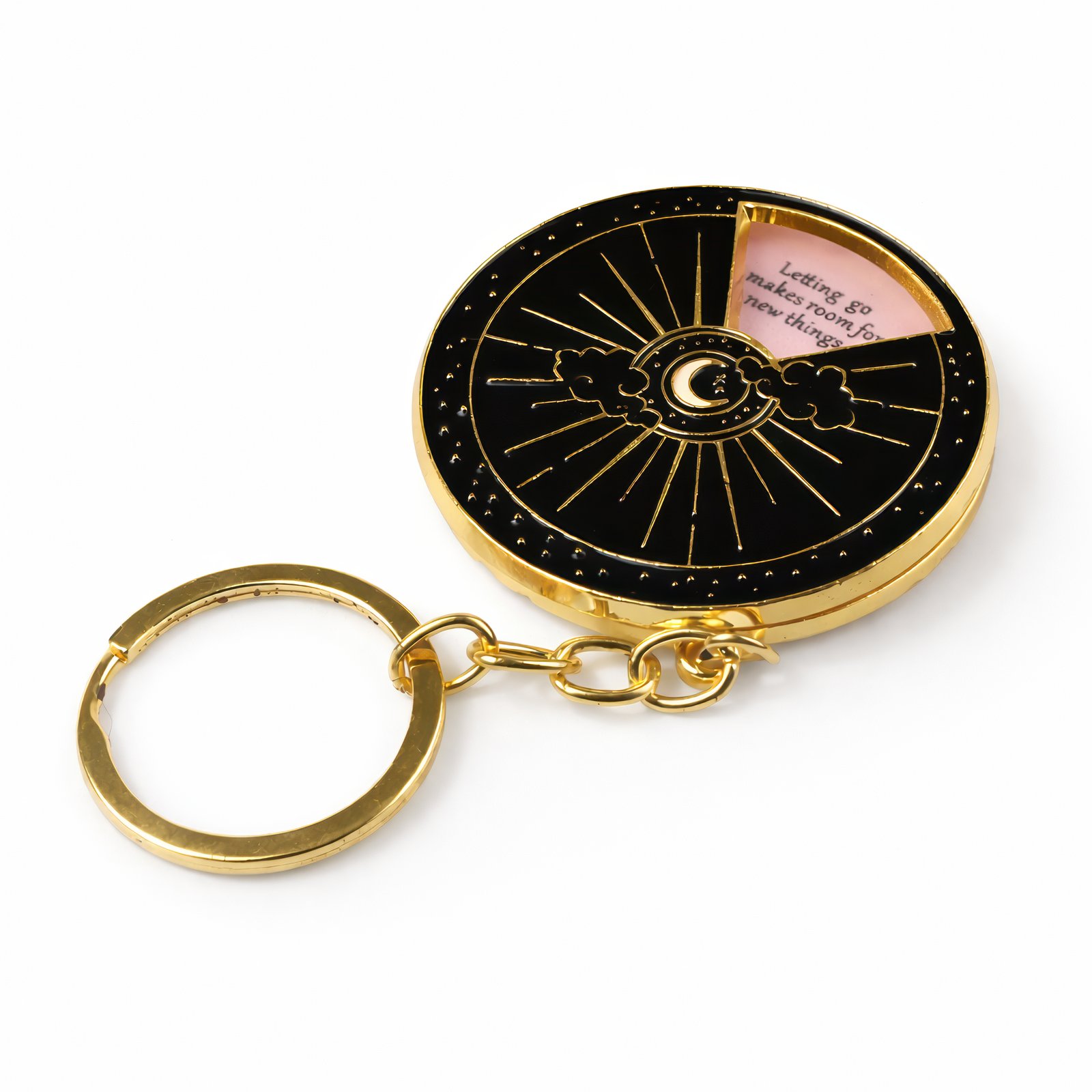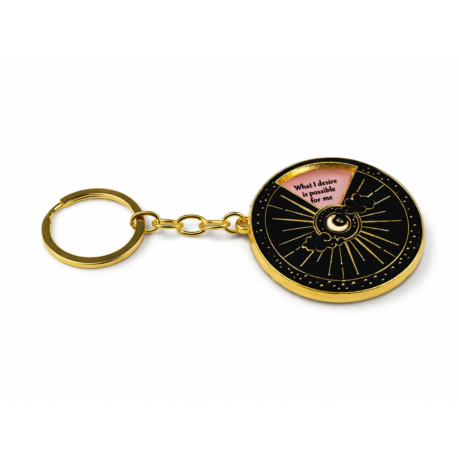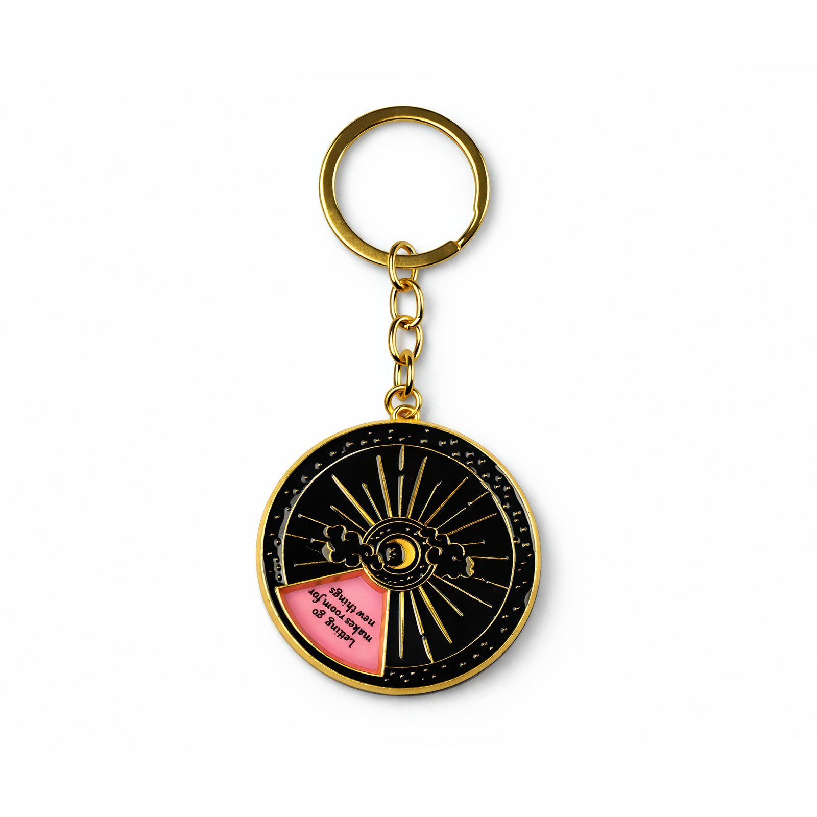This 5 cm metal keychain is a striking blend of celestial charm and inspirational flair. The circular pendant showcases a radiant sun with golden rays that burst from a central point, while a soft pink crescent moon sits gracefully amidst gentle white clouds. A subtle cut‑away section reveals a light‑colored background that frames uplifting phrases such as “What I desire is possible for me” and “Letting go makes room for new things,” adding a personal, motivational touch.