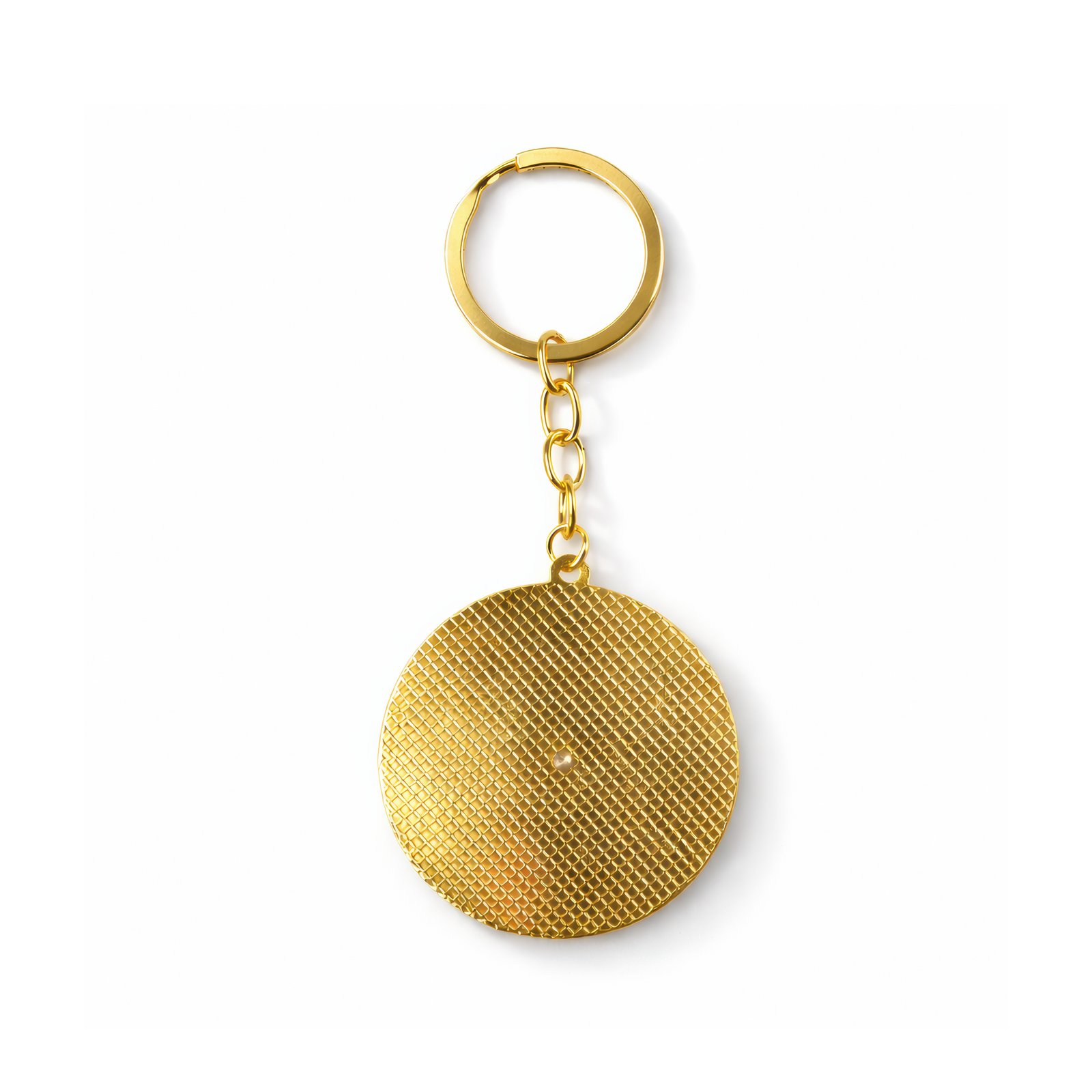 Crafted from a warm, gold‑tinted metal—likely brass—the front of the pendant sports a smooth, enamel‑like finish that brings the artwork to life. The back features a distinct textured pattern of repeating squares, giving depth and a vintage feel to the piece. A polished gold‑tone chain links the pendant to a sturdy keyring, ensuring durability while maintaining a polished look.