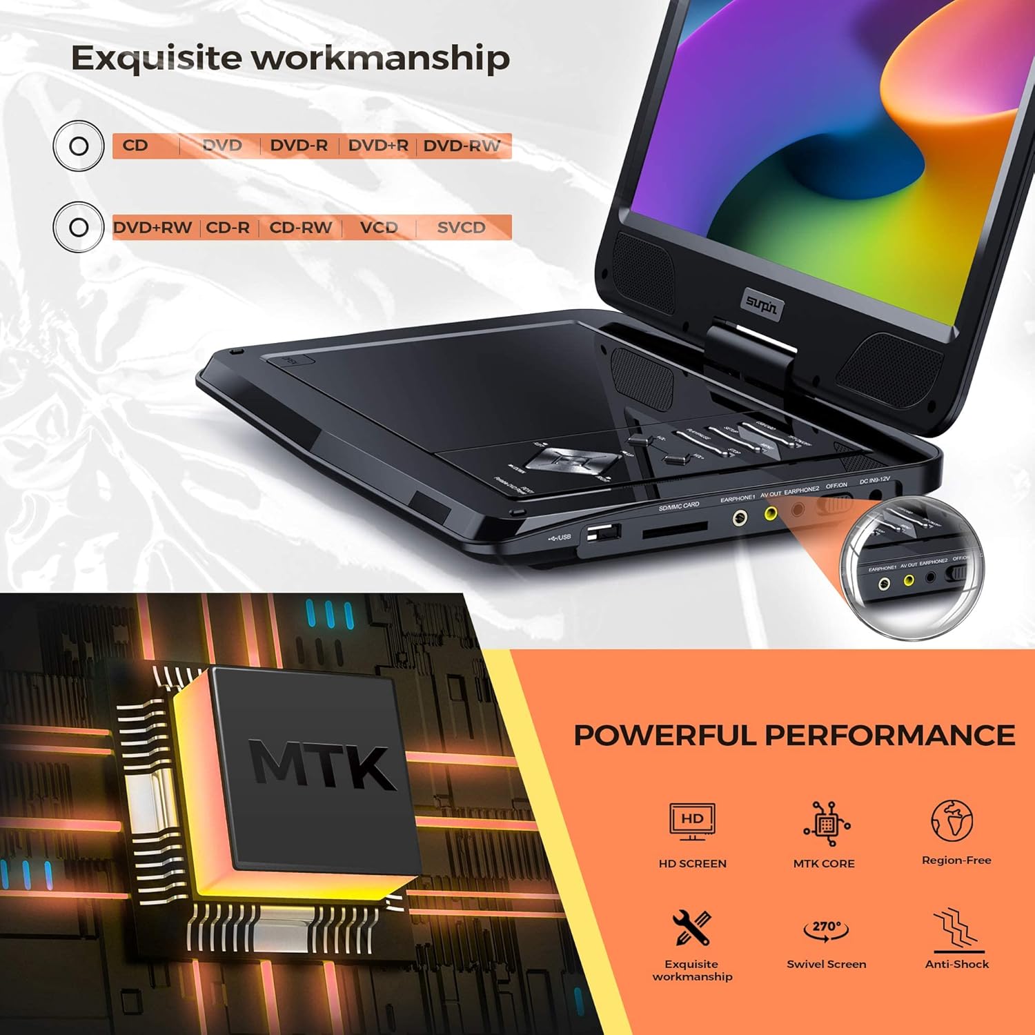 🔊SUNPIN Przenośny odtwarzacz DVD 12,5 cala z ekranem o przekątnej 10,5 cala, głośnikiem stereo i podwójnym gniazdem słuchawkowym, obsługa synchronizacji TV/USB/SD, uchwyt na zagłówek samochodowy🔊