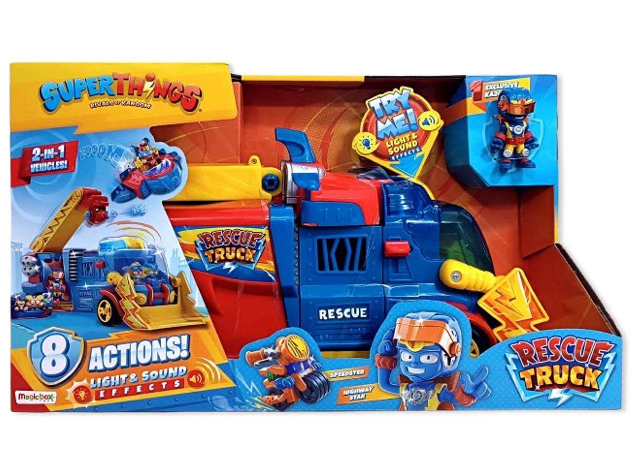 Ciężarówka Super Things Rescue Truck marki MagicBox o długości 43cm to wspaniała zabawka dla miłośników serii Super Zings. Zabawka wykonana jest z dobrych jakościowo materiałów i przeznaczona jest dla dzieci powyżej 3 roku życia. Ciężarówka zasilana jest 2 bateriami AAA 1,5V dołączonymi do zestawu. Pojazd posiada efekty świetlne i dźwiękowe. W skład zestawu wchodzi: Ciężarówka (Supertruck), Latający pojazd (Rescue Ship), Motor (Speedster) oraz jedna figurka (Highway Star).