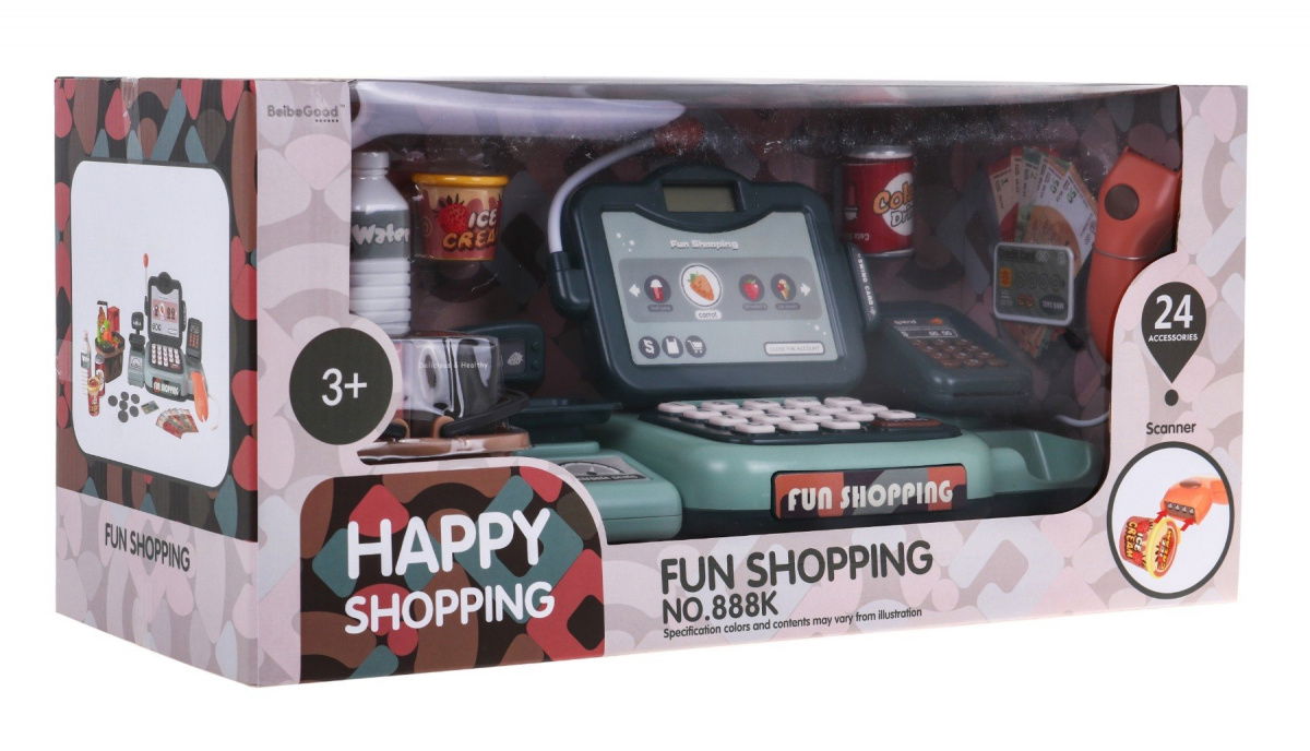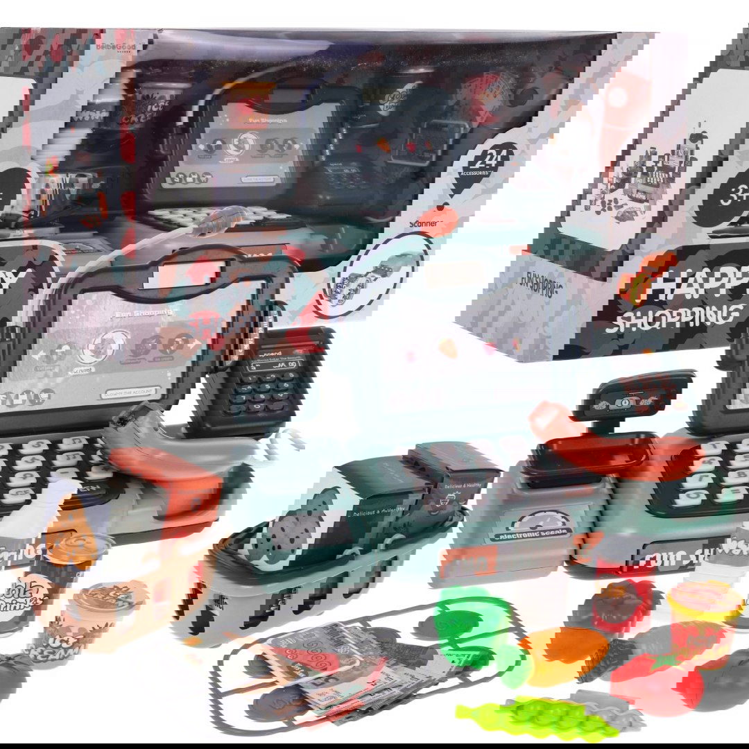 Dzięki czytnikowi kodów kreskowych i kart kredytowych, maluch może odgrywać role sprzedawcy i klienta. Kasa posiada mikrofon, wyświetlacz LCD, kalkulator, otwieraną szufladę, wciskaną wagę, elektroniczny czytnik kodów kreskowych i czytnik kart. Podczas skanowania produktów, zabawka wydaje realistyczne dźwięki i wyświetla cenę na ekranie LCD. Maluch może płacić kartą lub gotówką, a nawet wprowadzać PIN do czytnika. Mikrofon z nagłośnieniem dodaje realizmu całej zabawie. To nie tylko świetna zabawa, ale także sposób na rozwijanie wyobraźni, kreatywnego myślenia i naukę prostych działań matematycznych. W zestawie znajdują się kasa, waga, czytnik kart, czytnik kodów kreskowych, mikrofon, karta, gotówka, koszyk oraz produkty takie jak cola, lody, woda, marchewka, pomidor, groszek, papryka zielona, kartonik z ciasteczkami i kartonik z sokiem truskawkowym. Zabawka ma działający mikrofon, wciskaną wagę, wyświetlacz LCD, kalkulator, otwieraną szufladę, czytnik kodów kreskowych z dźwiękami oraz czytnik kart z efektami dźwiękowymi. Wymiary to ok. 27 cm x 16 cm x 14 cm dla kasy, ok. 11 cm x 8 cm x 5 cm dla koszyka i ok. 43 cm x 20,5 cm x 19 cm dla opakowania. Zostań małym sprzedawcą i baw się w sklep