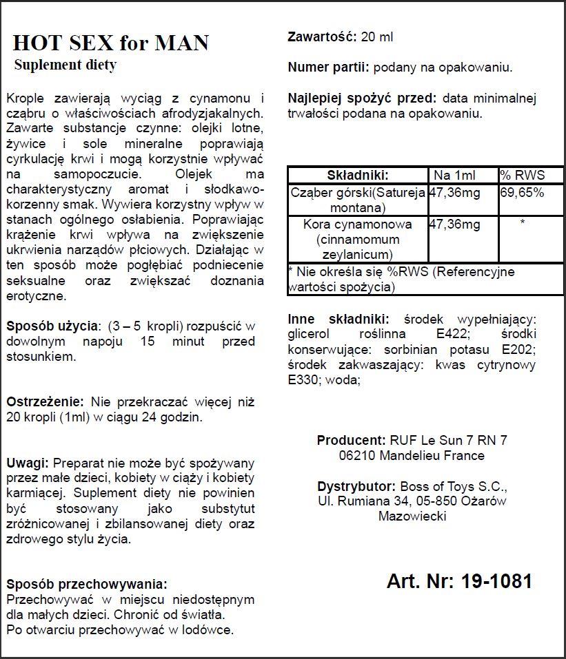 Hot Sex w wersji dla mężczyzn to suplement diety w postaci płynu, który został specjalnie opracowany dla zwiększenia pociągu seksualnego u mężczyzn. Oddziałowując na cały organizm i poprawiając ukrwienie bez wątpienia wpływa pozytywnie na męską strefę genitalną. W ten sposób wpływa oczywiście również na podniecenie seksualne i odczuwalność doznań erotycznych.