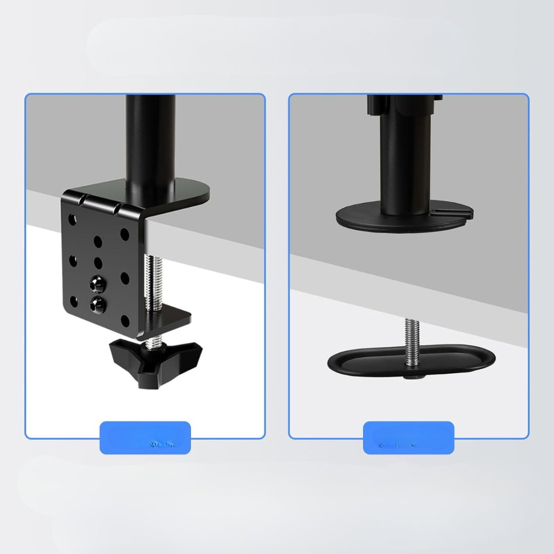 - Dwie opcje montażu: zacisk typu C-clamp lub opcjonalna podstawa przelotowa (grommet) przeznaczona do biurek o grubości do 10 cm, co pozwala zaoszczędzić miejsce na blacie.