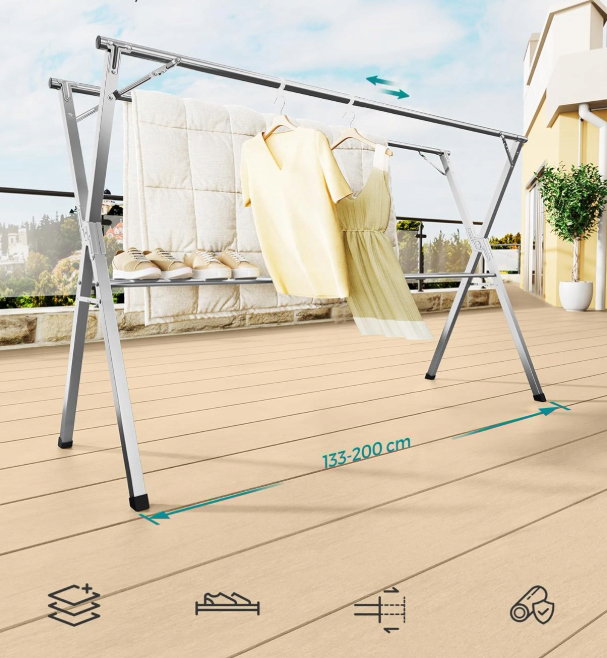 - ✴️Przestronna i wysuwana - ta suszarka na pranie jest wyposażona w 2 wysuwane drążki wiszące, które można przedłużyć z 133 do 200 cm – wystarczająco dużo miejsca do suszenia i organizacji prania. Ponadto stojak ma nawet miejsce na Twoje buty