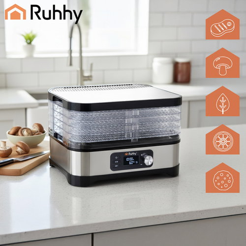 Chcesz mieć domowe zapasy przez cały rok? Suszarka spożywcza RUHHY szybko i równomiernie suszy grzyby, owoce, warzywa i zioła. Aż 5 tacek (10 l pojemności), precyzyjna regulacja 35-70°C, programator do 72 h oraz wyświetlacz LCD zapewniają pełną kontrolę nad procesem – wygodnie, czysto i oszczędnie. W komplecie zestaw praktycznych tacek, mat i sitek, nożyk 3w1 i szczypce.