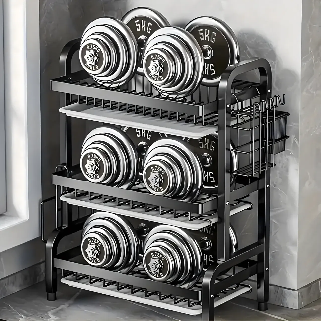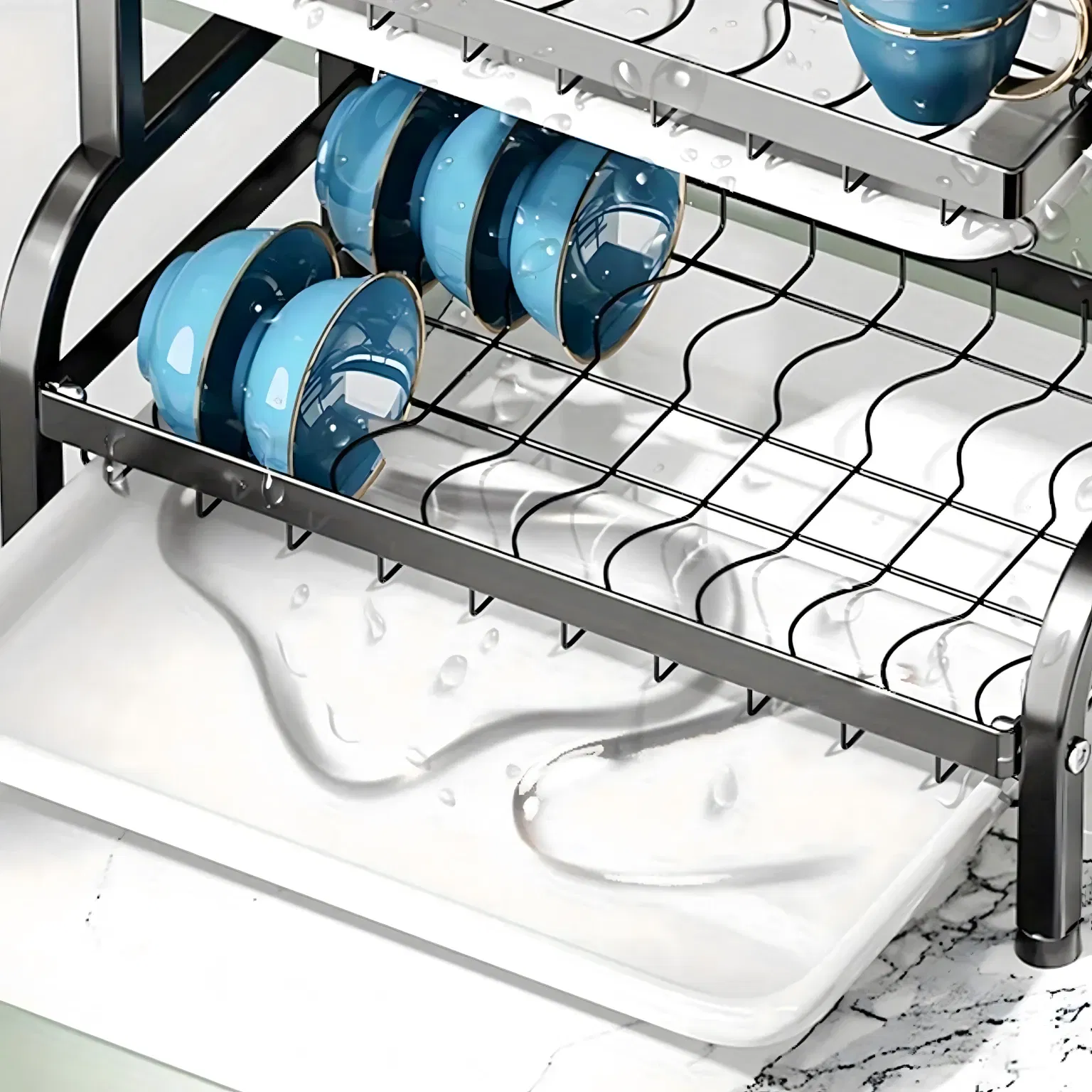 Trzypoziomowa suszarka do naczyń XXL – czarna, stal nierdzewna.