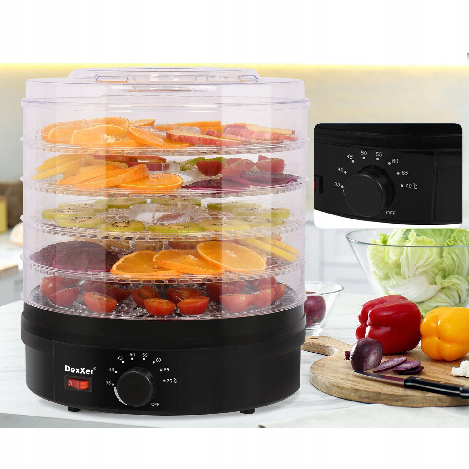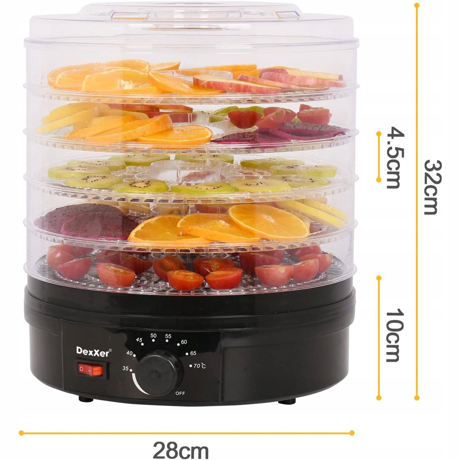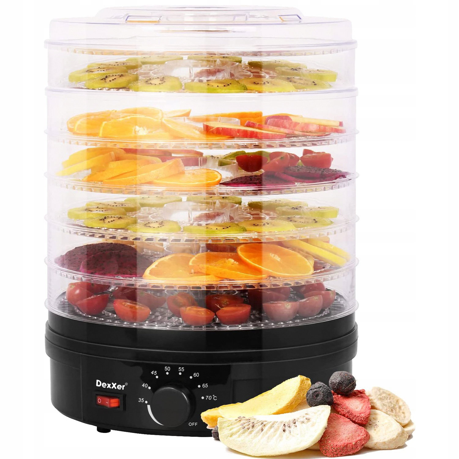 ➡️ 5 niezależnych poziomów, które umożliwiają równoczesne suszenie różnych rodzajów owoców i warzyw