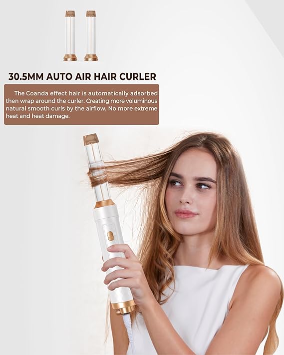 Silny strumień powietrza wydmuchuje się z nasadki lokówki, tworząc w sposób ciągły otaczający lokówkę strumień powietrza zgodny z ruchem wskazówek zegara. Efekt wzmocnionego Coandy sprawia, że włosy automatycznie przylegają do powierzchni, tworząc loki w prawo i w lewo. Tworzy obszerne, gładkie i naturalne loki bez nadmiernego nagrzewania, tworząc bezproblemowe loki w ciągu kilku sekund. Lokówka do włosów 6 w 1 Spełni wszystkie Twoje potrzeby związane ze stylem i bądź najbardziej lśniącą królową.