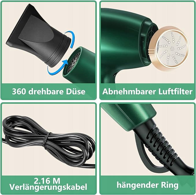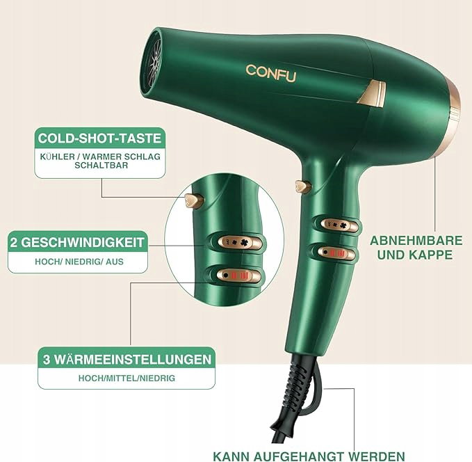 Wydajna i szybkoschnąca: suszarka do włosów jest wyposażona w moc 2100 W-2400 W, która spełnia wymagania profesjonalnych salonów fryzjerskich. Do codziennego użytku w domu silny wiatr może pomóc Ci szybciej wysuszyć włosy i zaoszczędzić cenny czas.