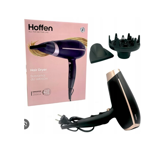 Suszarka do włosów marki Hoffen to profesjonalne urządzenie, które zapewni sprawne suszenie i stylizacje włosów.Hoffen o mocy 1800-2200W.Funkcja zimnego nawiewu ,dwie prędkości pracy oraz trzy poziomy ustawień temperatury pozwalają na dostosowanie suszarki pod Twoje potrzeby, a poręczny uchwyt do zawieszania ułatwi wygodne przechowywanie urządzenia w Twoim domu.