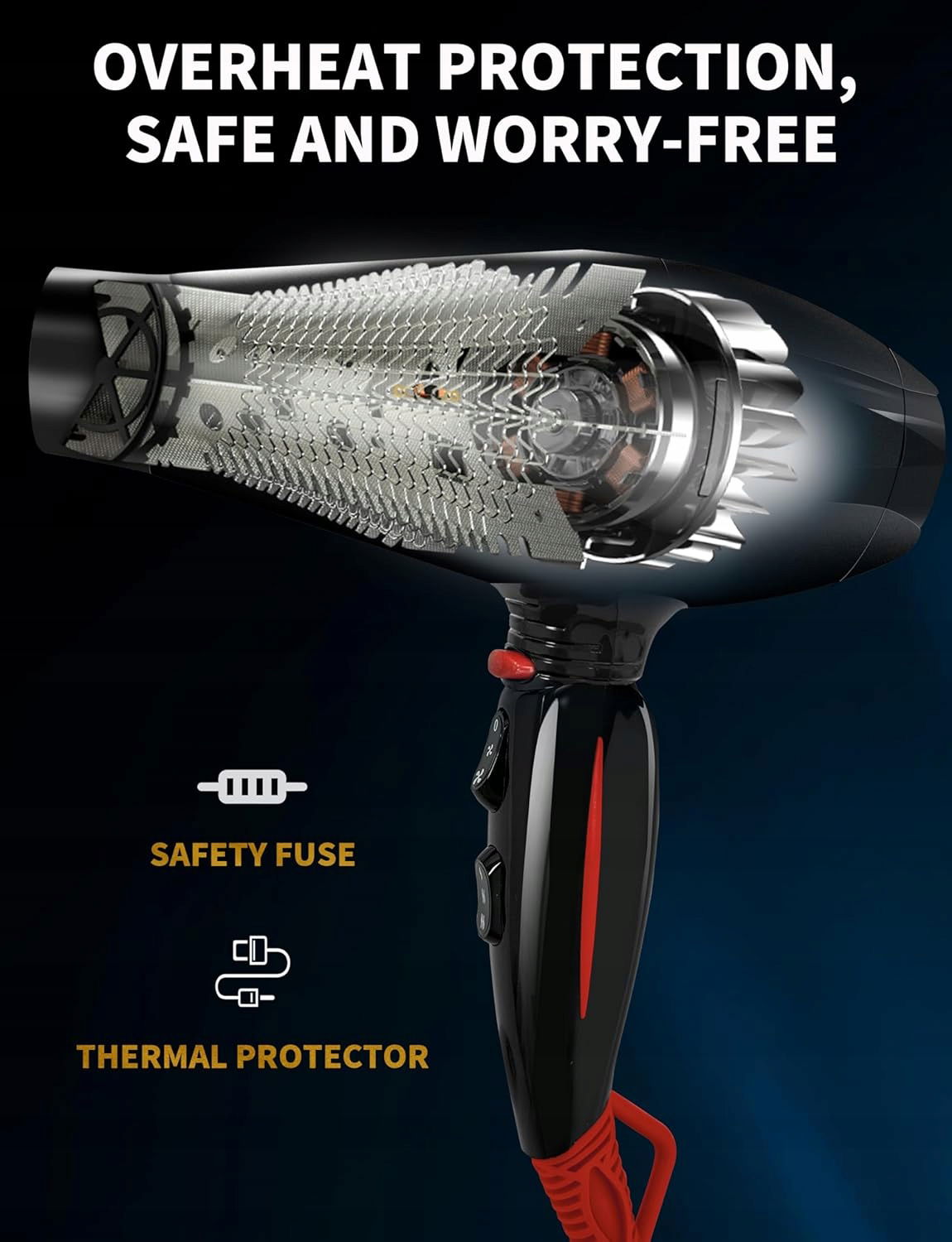 OCHRONA PRZED PRZEGRZANIEM - Nasza profesjonalna suszarka do włosów jest wyposażona w zaawansowaną ochronę przed przegrzaniem, która zapewnia zarówno bezpieczeństwo, jak i trwałość. Technologia ta automatycznie wyłącza suszarkę, gdy osiągnie ona temperaturę 150°C, zapobiegając uszkodzeniom spowodowanym przegrzaniem.