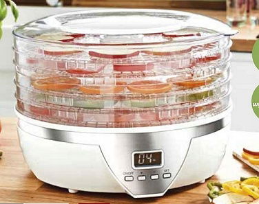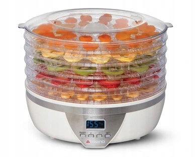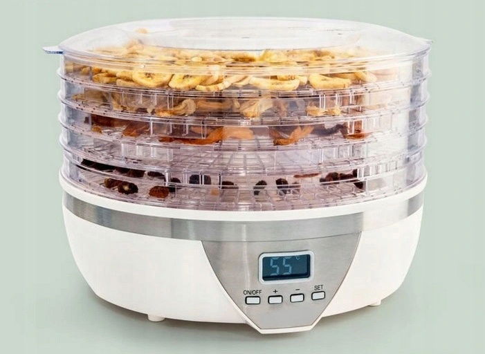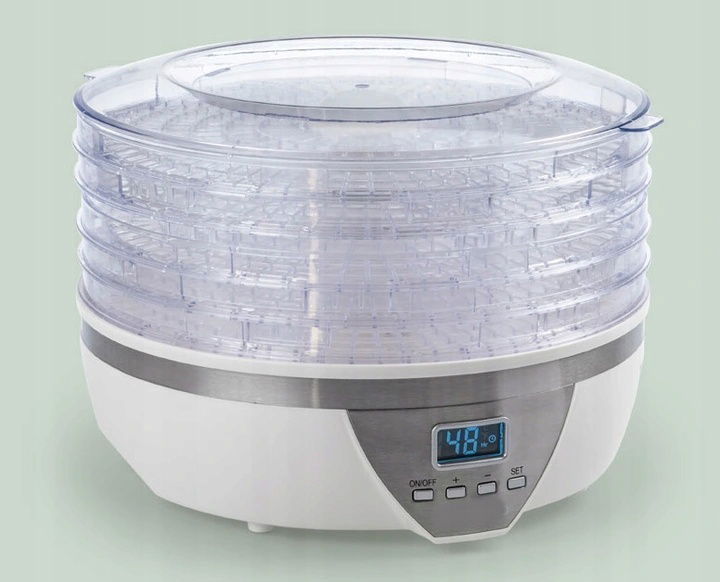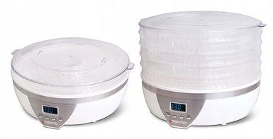 - Dehydrator ma w zestawie aż 5 tac suszących.