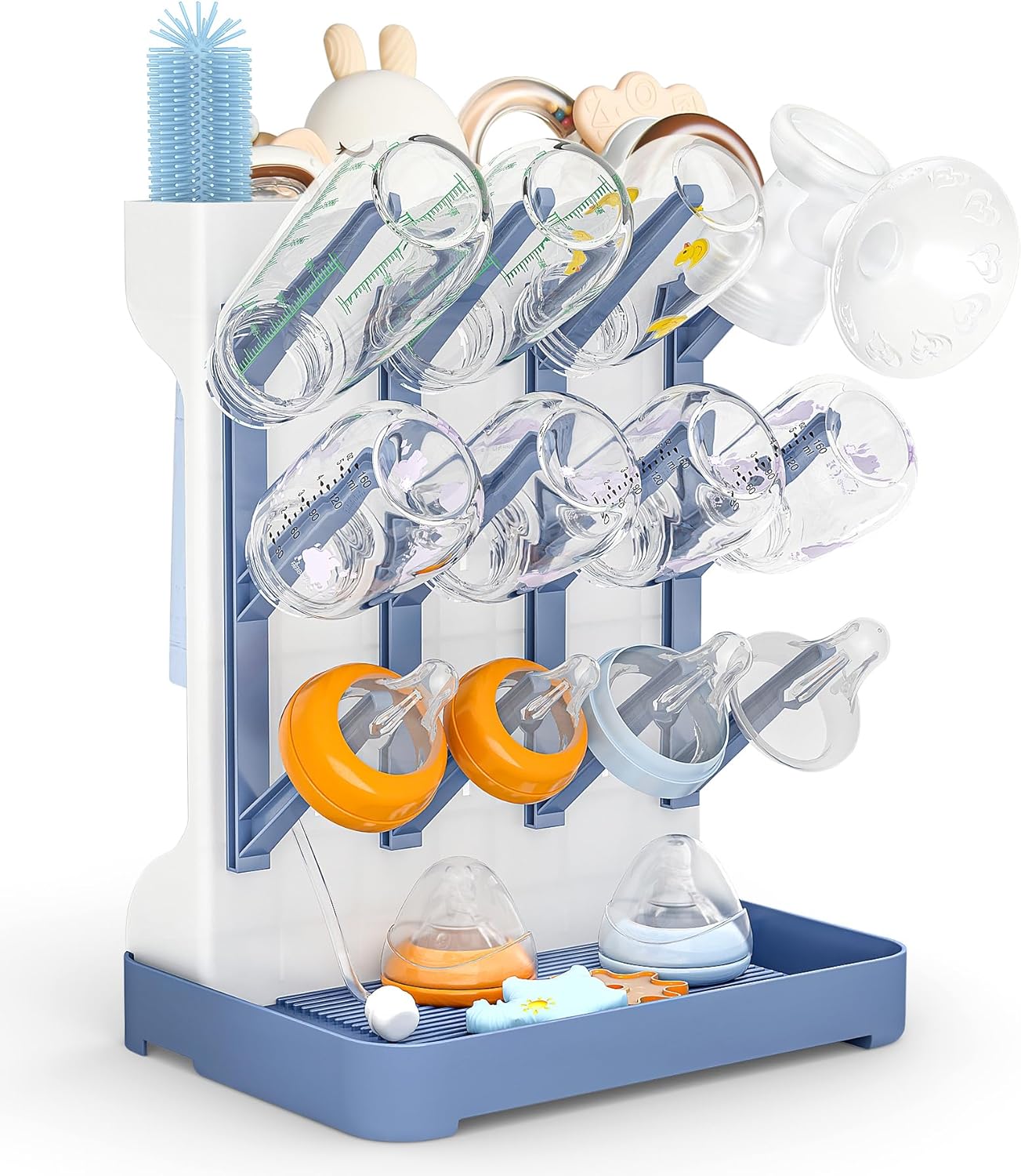 Suszarka została zaprojektowana tak, aby pomieścić jednocześnie wiele butelek o różnych rozmiarach oraz dodatkowe akcesoria, takie jak smoczki, nakrętki, osłonki czy kubeczki. Specjalne uchwyty i wystające elementy umożliwiają wygodne rozmieszczenie wszystkich części, bez ryzyka ich zsuwania się.