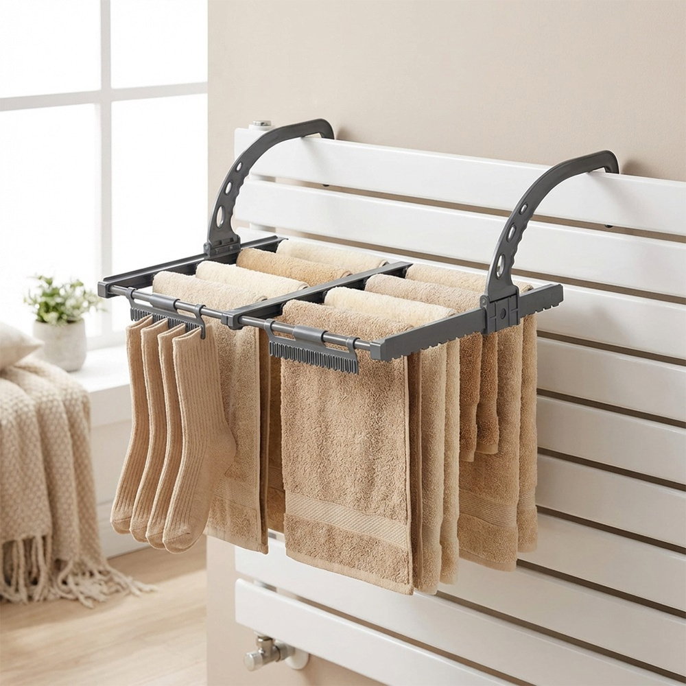 Rozsuwana suszarka na pranie na kaloryfer, idealna także jako suszarka balkonowa lub łazienkowa. Idealna do małych pomieszczeń, świetnie sprawdzi się podczas wyjazdów np. na narty. Łatwy montaż sprawi, że zainstalowanie jej na grzejniku lub balustradzie nie sprawi problemu. Dzięki kompaktowej formie można w łatwy sposób przechowywać suszarkę w przypadku, gdy nie jest używana.