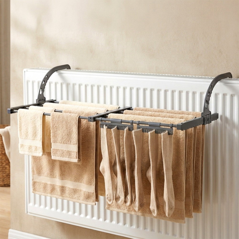 Rozsuwana suszarka na pranie na kaloryfer, idealna także jako suszarka balkonowa lub łazienkowa. Idealna do małych pomieszczeń, świetnie sprawdzi się podczas wyjazdów np. na narty. Łatwy montaż sprawi, że zainstalowanie jej na grzejniku lub balustradzie nie sprawi problemu. Dzięki kompaktowej formie można w łatwy sposób przechowywać suszarkę w przypadku, gdy nie jest używana.