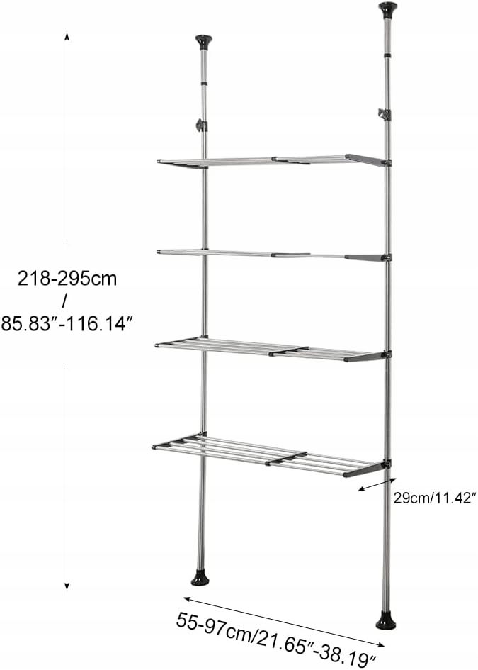 Łatwy montaż: Nie wymaga narzędzi montażowych, bez wiercenia, bez uszkadzania podłogi lub sufitu. Wykonany z rury kompozytowej ze stali nierdzewnej + ABS, trwały i wytrzymały. Materiał: rura kompozytowa ze stali nierdzewnej + ABS; wymiary ok. : Wysokość --- 218-295 cm (85,83-116,14 cala); długość półki---55-97 cm (21,65-38,19 cala); szerokość półki---29 cm (11,42 cala)